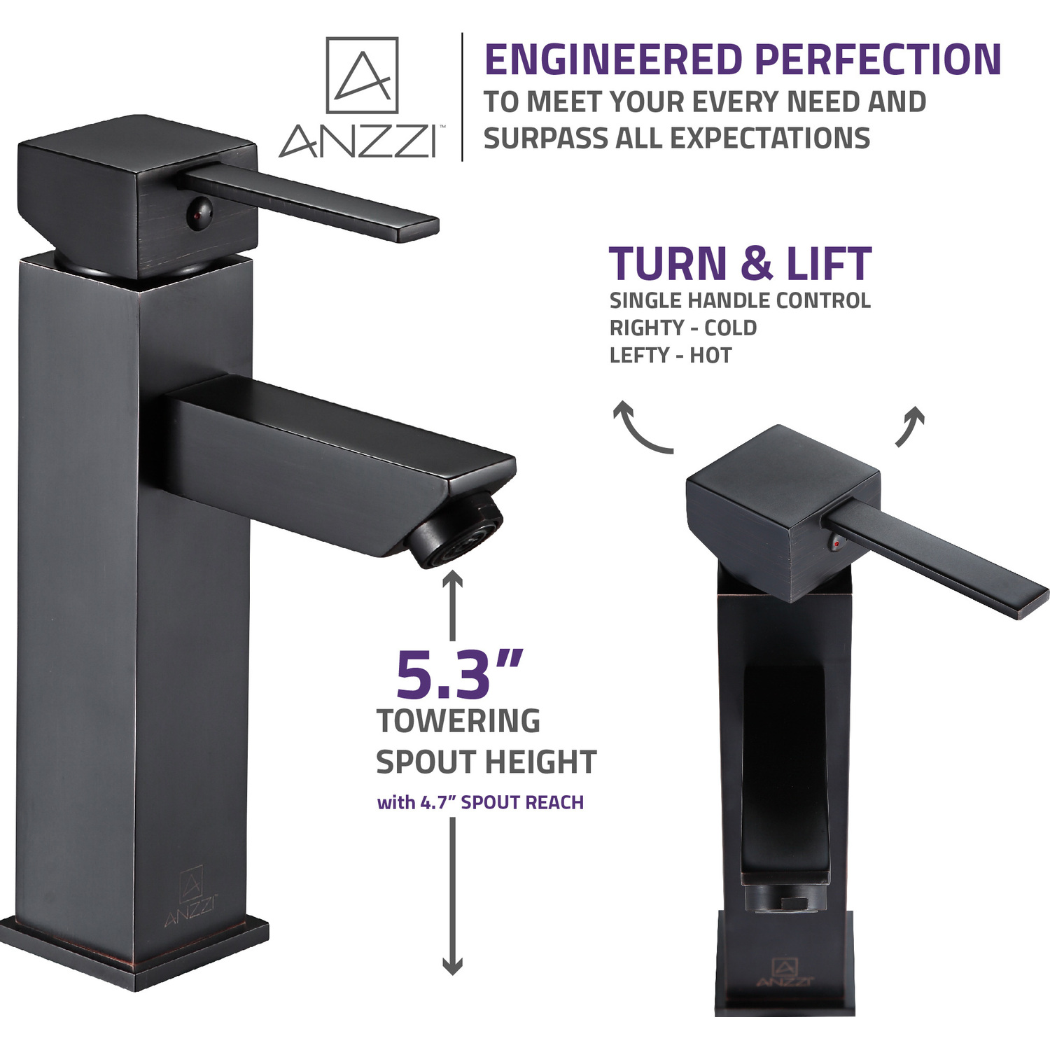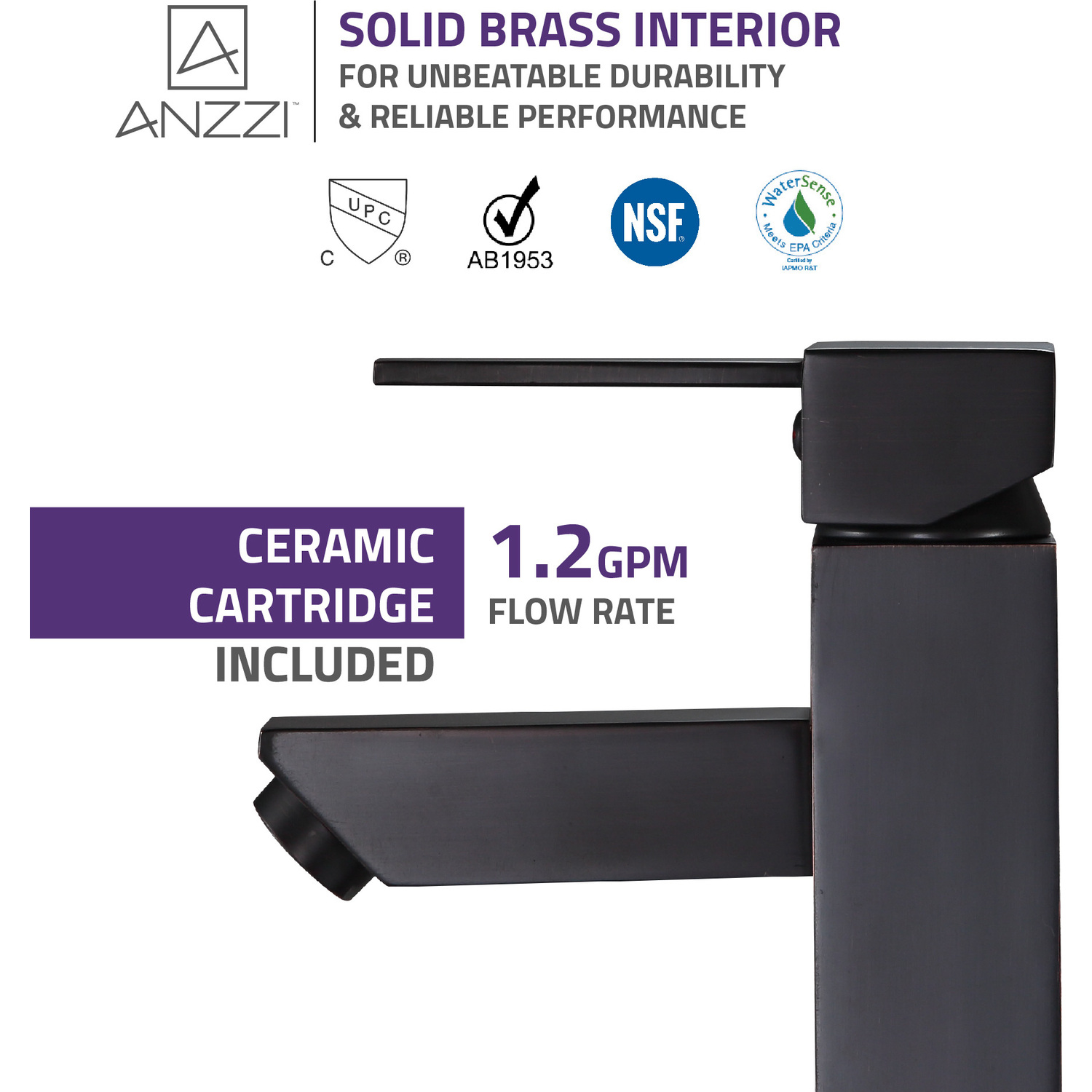 ANZZI is committed to introducing the latest in European bath fixture design to the North American home. ANZZI presents the Pygmy single handle bathroom sink faucet. Crafted using RHINO ALLOY certified brass interior, marine grade ceramic disk and oil rubbed bronze lead-free rust resistant finish. The elegance and style of our ANZZI faucets is matched by their proven performance and reliability, which is why our faucets are backed by the ANZZI Limited Lifetime Warranty. Become a member of the ANZZI family and experience why Perfection is our Tradition.Elegant oil rubbed bronze finishRHINO ALLOY certified lead-free solid brass with rust resistant finishSingle (1) handle operationSingle (1) hole installationMarine grade ceramic disk includedSpout reach: 4.72 in.; spout height: 5.31 in.Flow rate: 1.2 gpmConnection size: 3/8 in.cUPC, NSF, AB1953 and Watersense certifiedLimited lifetime warrantyShips from factory within 24 hours of orderTo speak to a knowledgeable and dedicated ANZZI specialist simply call 1-844-44-ANZZI or visit us on the web at www.ANZZI.com