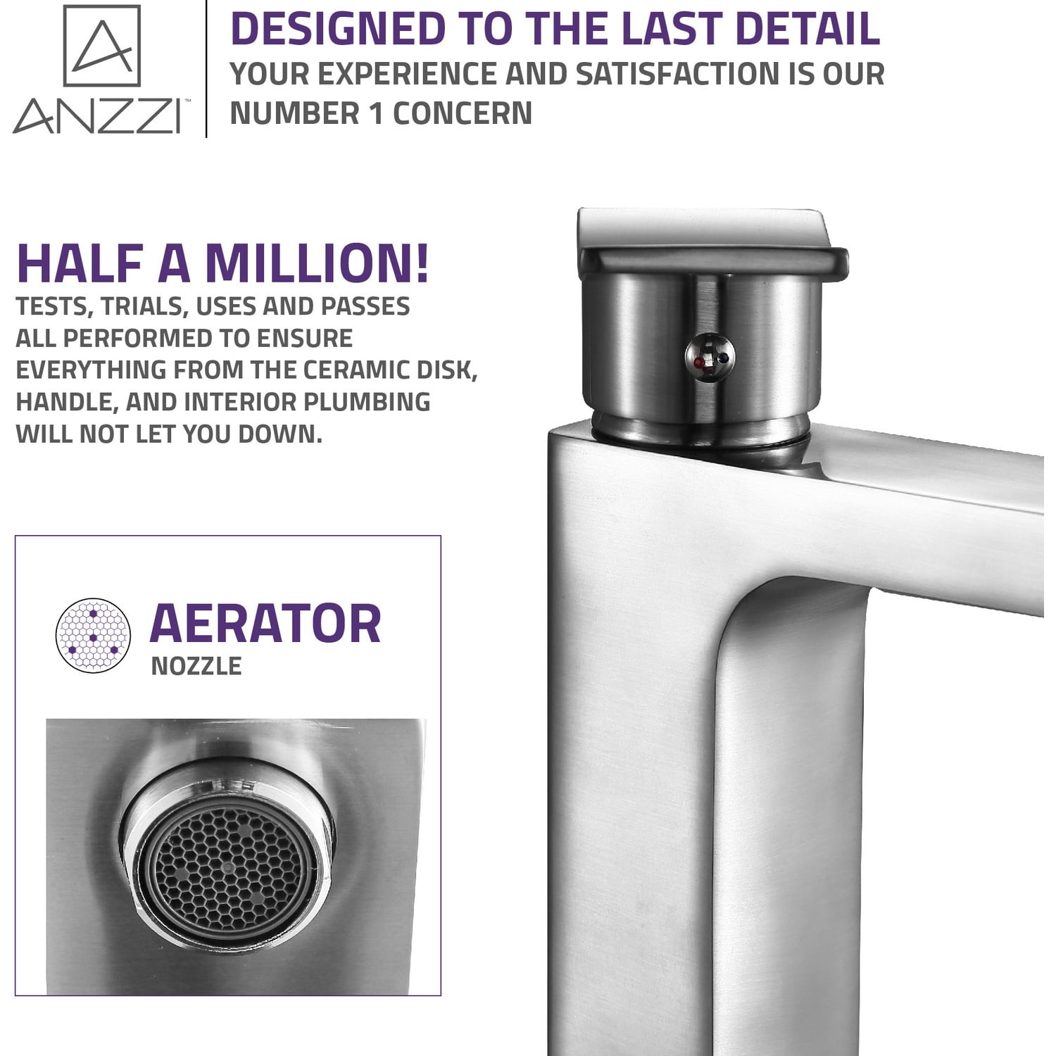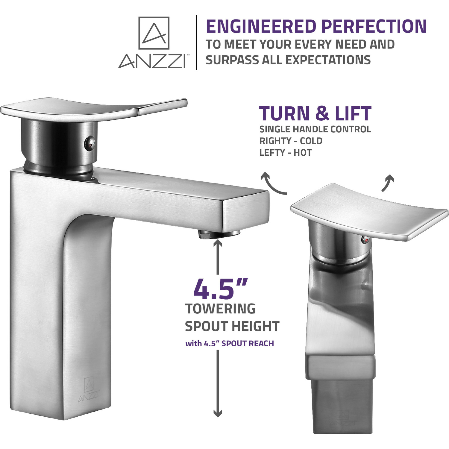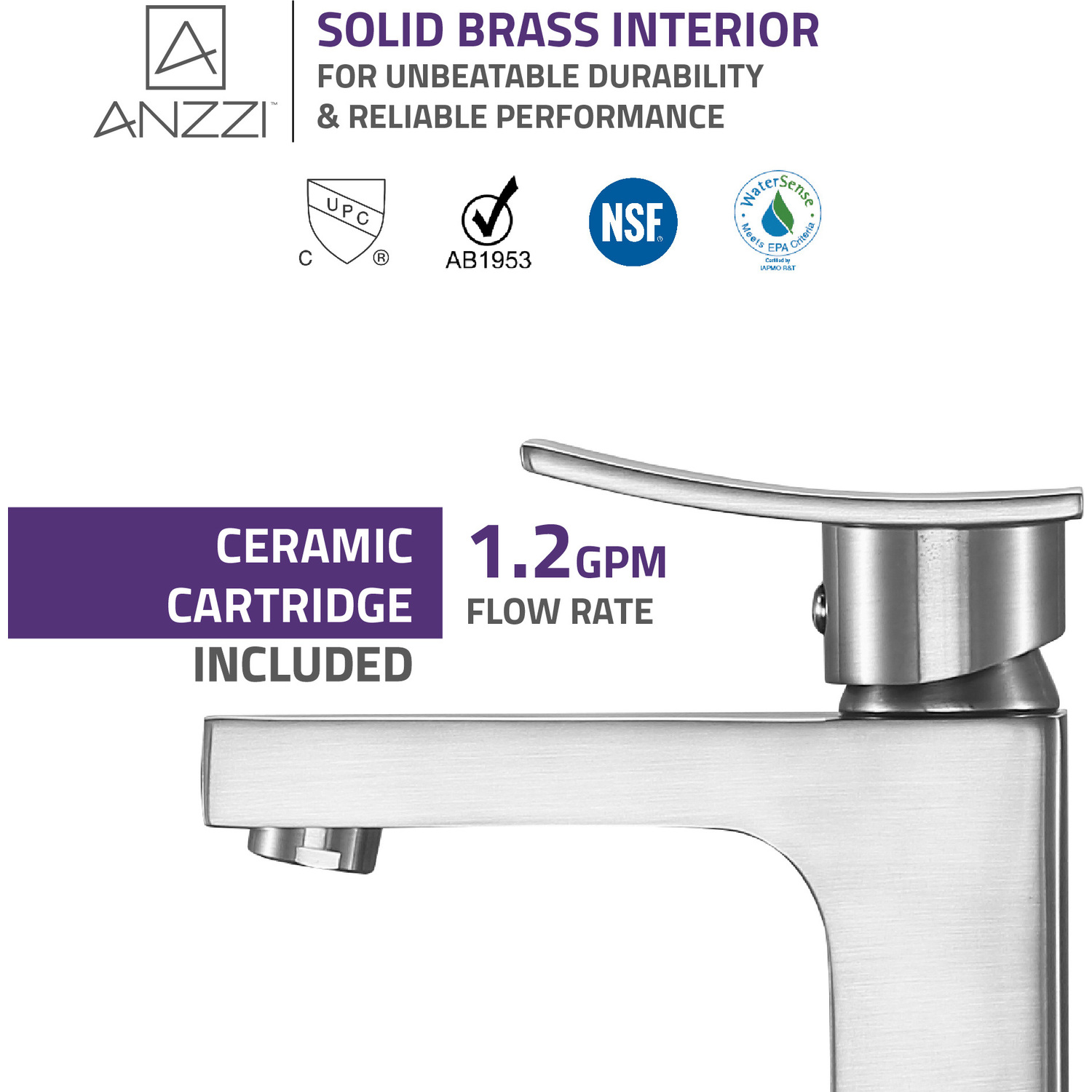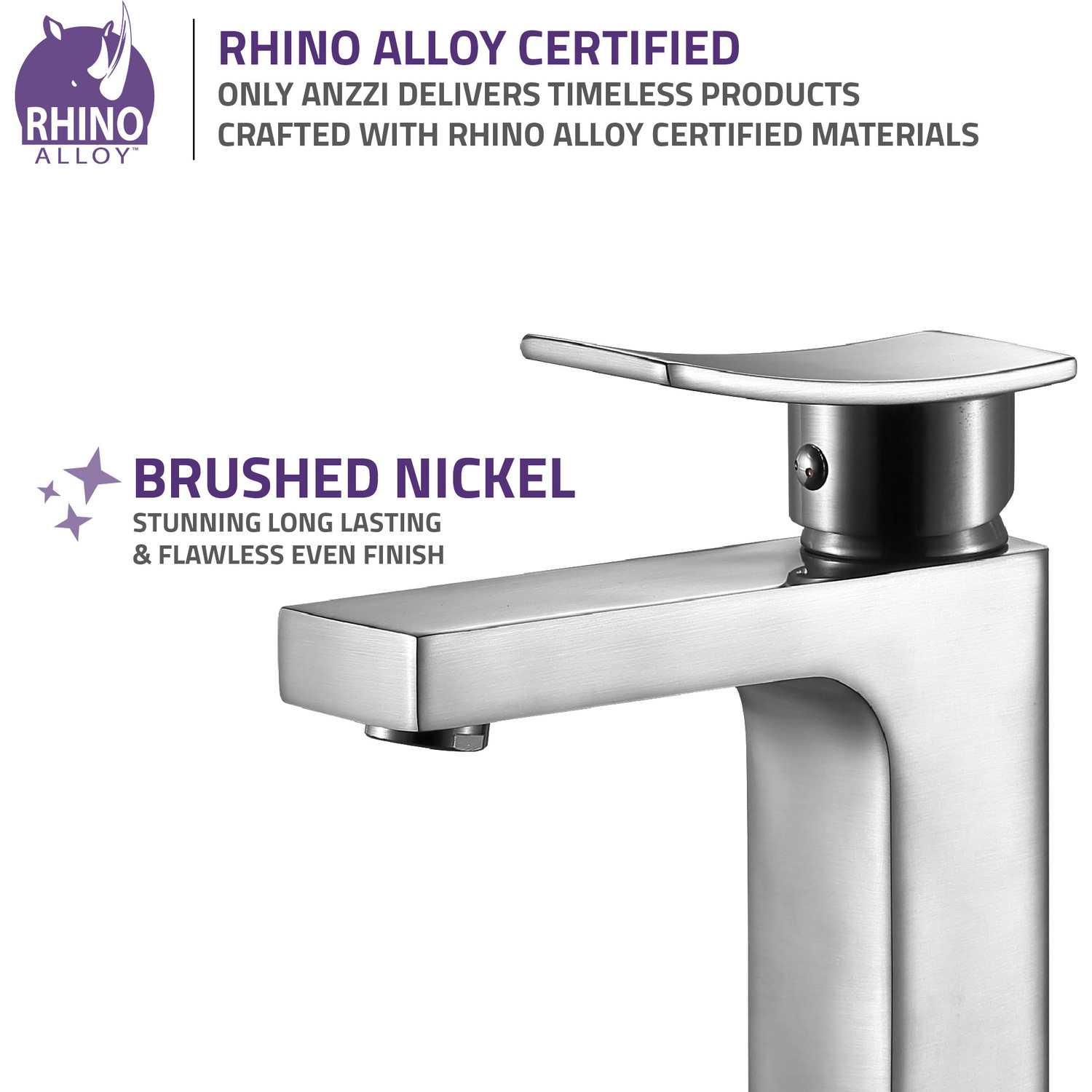 ANZZI is committed to introducing the latest in European bath fixture design to the North American home. ANZZI presents the Promenade single handle bathroom sink faucet. Crafted using RHINO ALLOY certified brass interior, marine grade ceramic disk and brushed nickel lead-free rust resistant finish. The elegance and style of our ANZZI faucets is matched by their proven performance and reliability, which is why our faucets are backed by the ANZZI Limited Lifetime Warranty. Become a member of the ANZZI family and experience why Perfection is our Tradition.Stunning brushed nickel finishRHINO ALLOY certified lead-free solid brass with rust resistant finishSingle (1) handle operationSingle (1) hole installationMarine grade ceramic disk includedSpout reach: 4.53 in.; spout height: 4.53 in.Flow rate: 1.2 gpmConnection size: 3/8 in.cUPC, NSF, AB1953 and Watersense certifiedLimited lifetime warrantyShips from factory within 24 hours of orderTo speak to a knowledgeable and dedicated ANZZI specialist simply call 1-844-44-ANZZI or visit us on the web at www.ANZZI.com