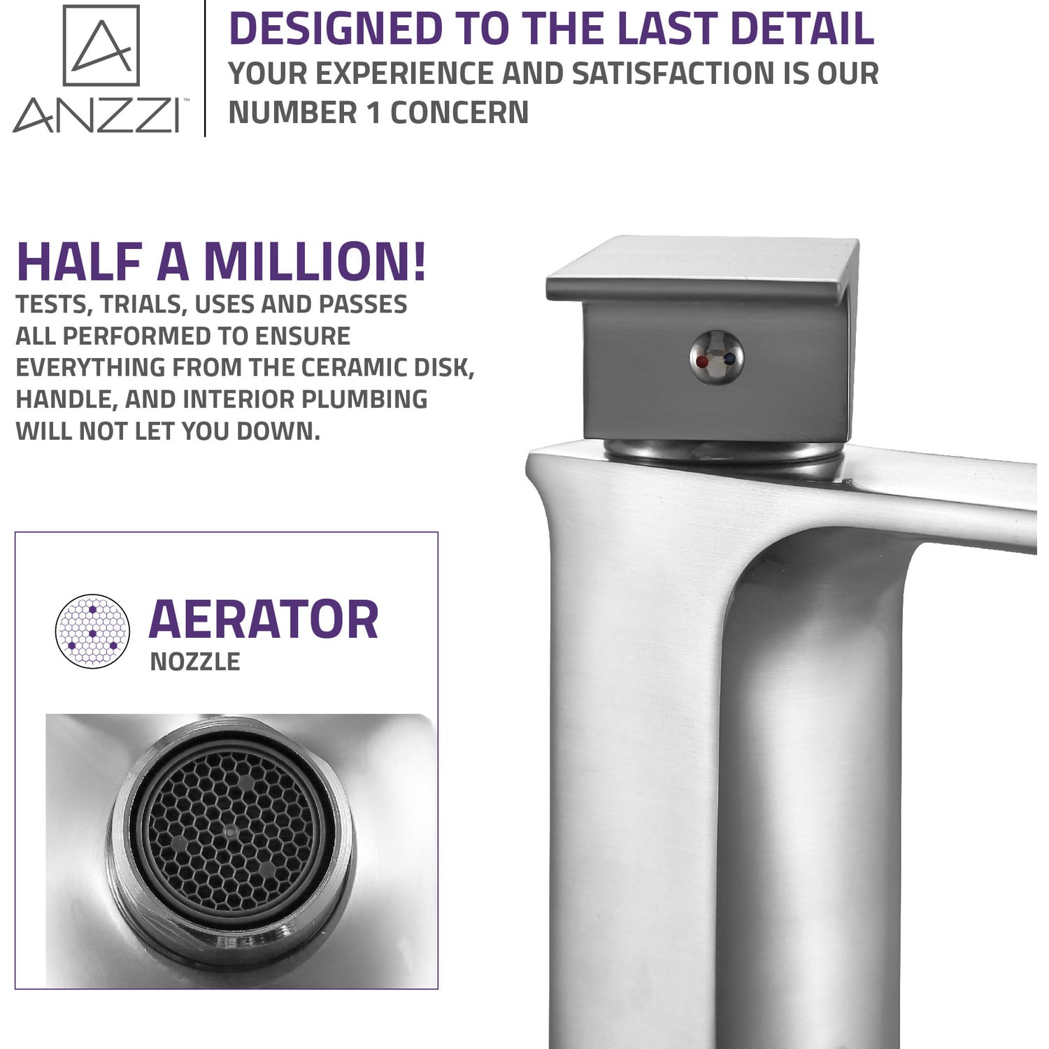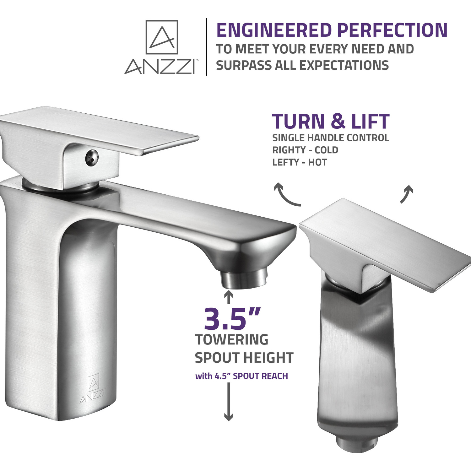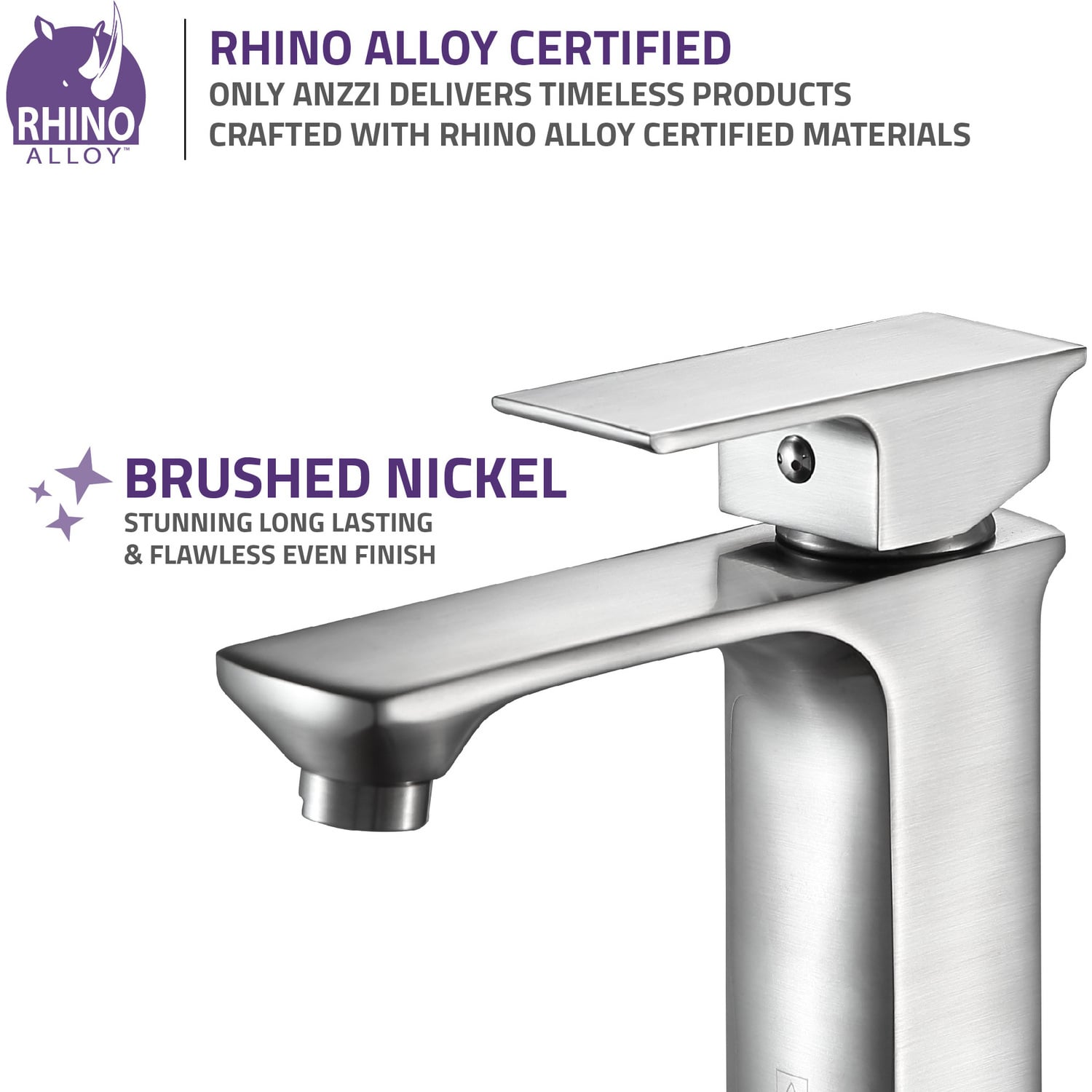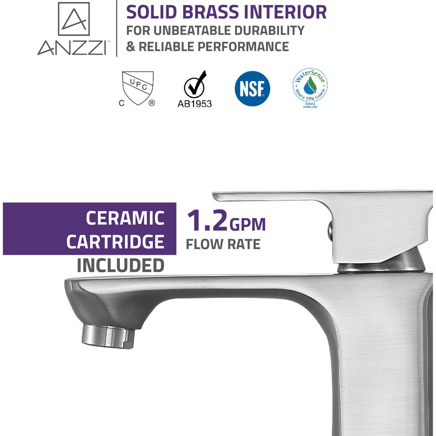 ANZZI is committed to introducing the latest in European bath fixture design to the North American home. ANZZI presents the Promenade single handle bathroom sink faucet. Crafted using RHINO ALLOY certified brass interior, marine grade ceramic disk and brushed nickel lead-free rust resistant finish. The elegance and style of our ANZZI faucets is matched by their proven performance and reliability, which is why our faucets are backed by the ANZZI Limited Lifetime Warranty. Become a member of the ANZZI family and experience why Perfection is our Tradition.Stunning brushed nickel finishRHINO ALLOY certified lead-free solid brass with rust resistant finishSingle (1) handle operationSingle (1) hole installationMarine grade ceramic disk includedSpout reach: 4.92 in.; spout height: 3.54 in.Flow rate: 1.2 gpmConnection size: 3/8 in.cUPC, NSF, AB1953 and Watersense certifiedLimited lifetime warrantyShips from factory within 24 hours of orderTo speak to a knowledgeable and dedicated ANZZI specialist simply call 1-844-44-ANZZI or visit us on the web at www.ANZZI.com