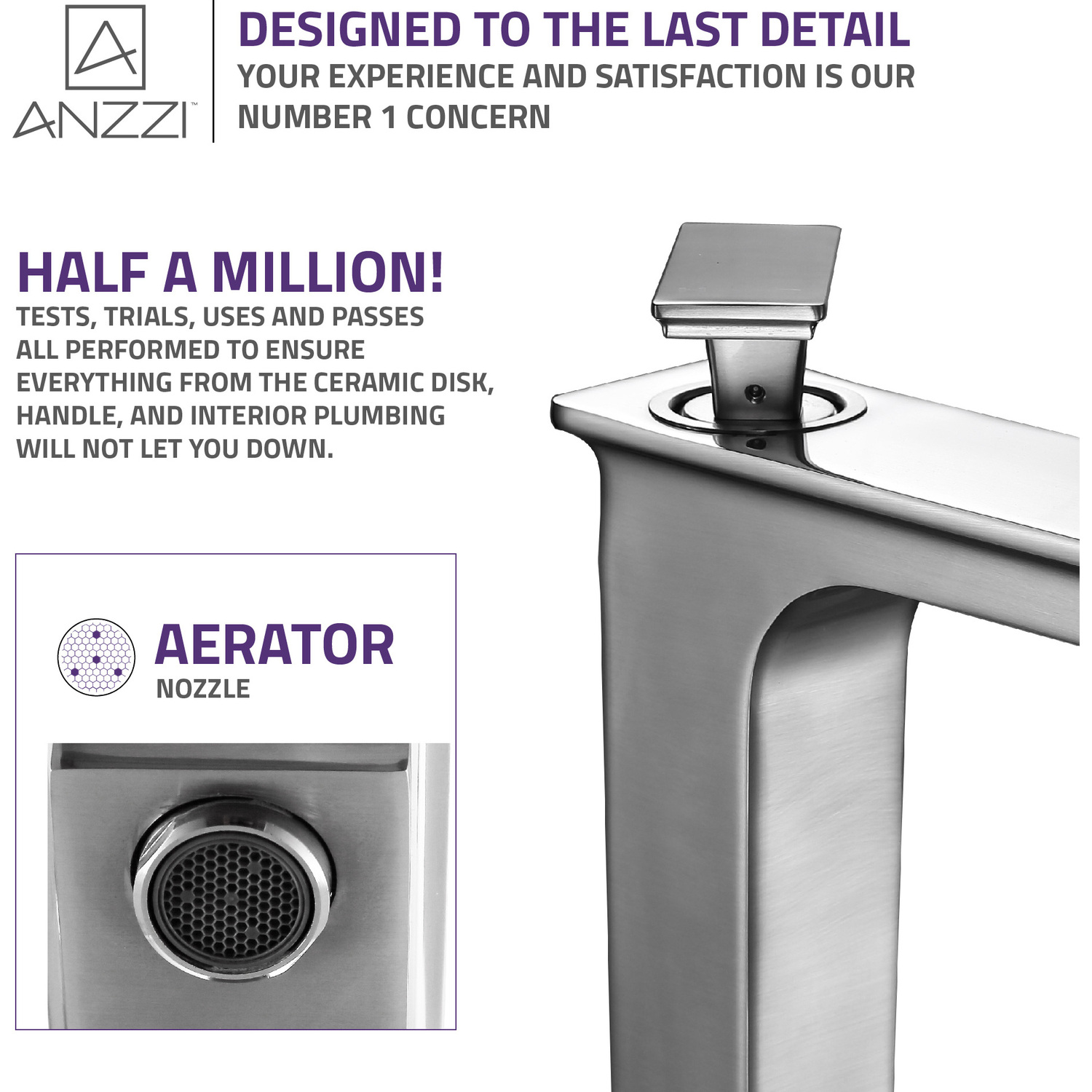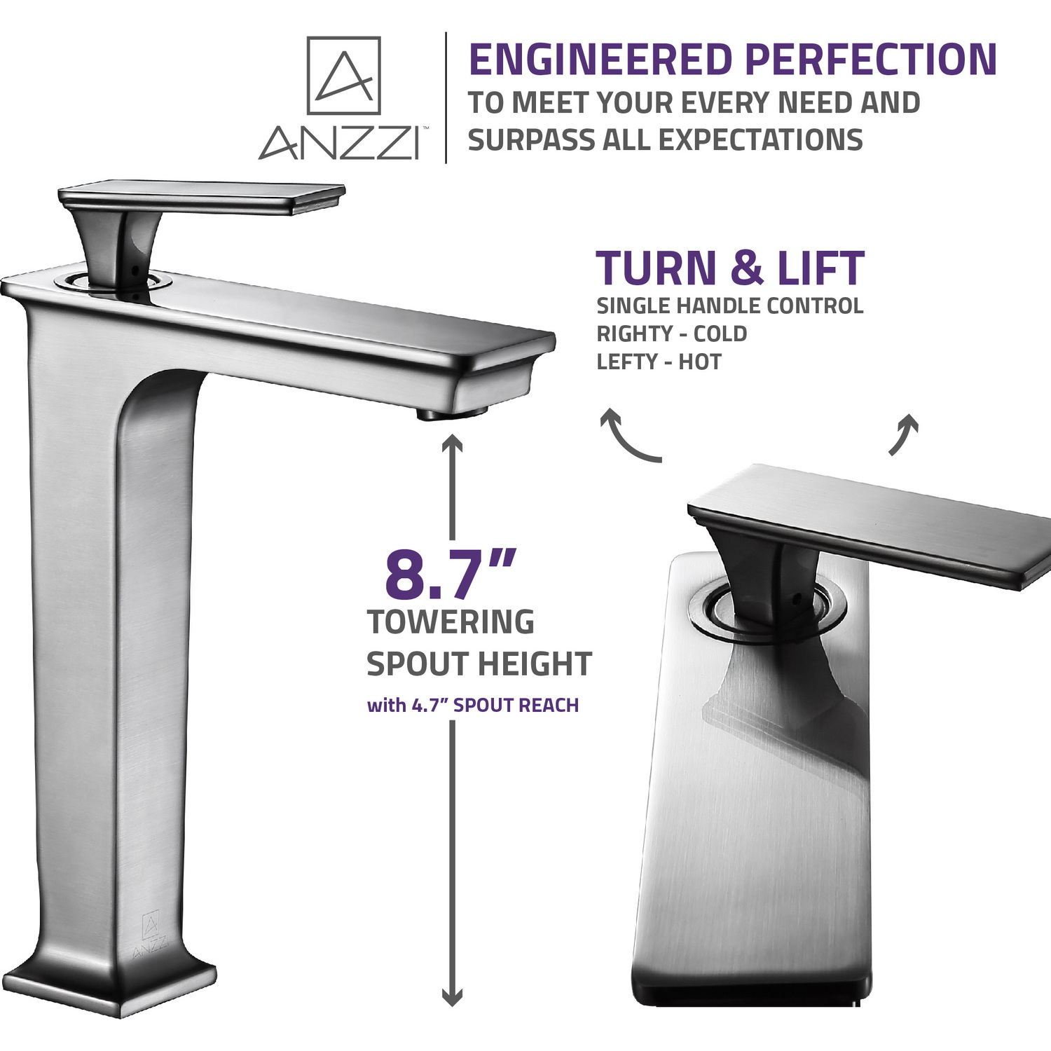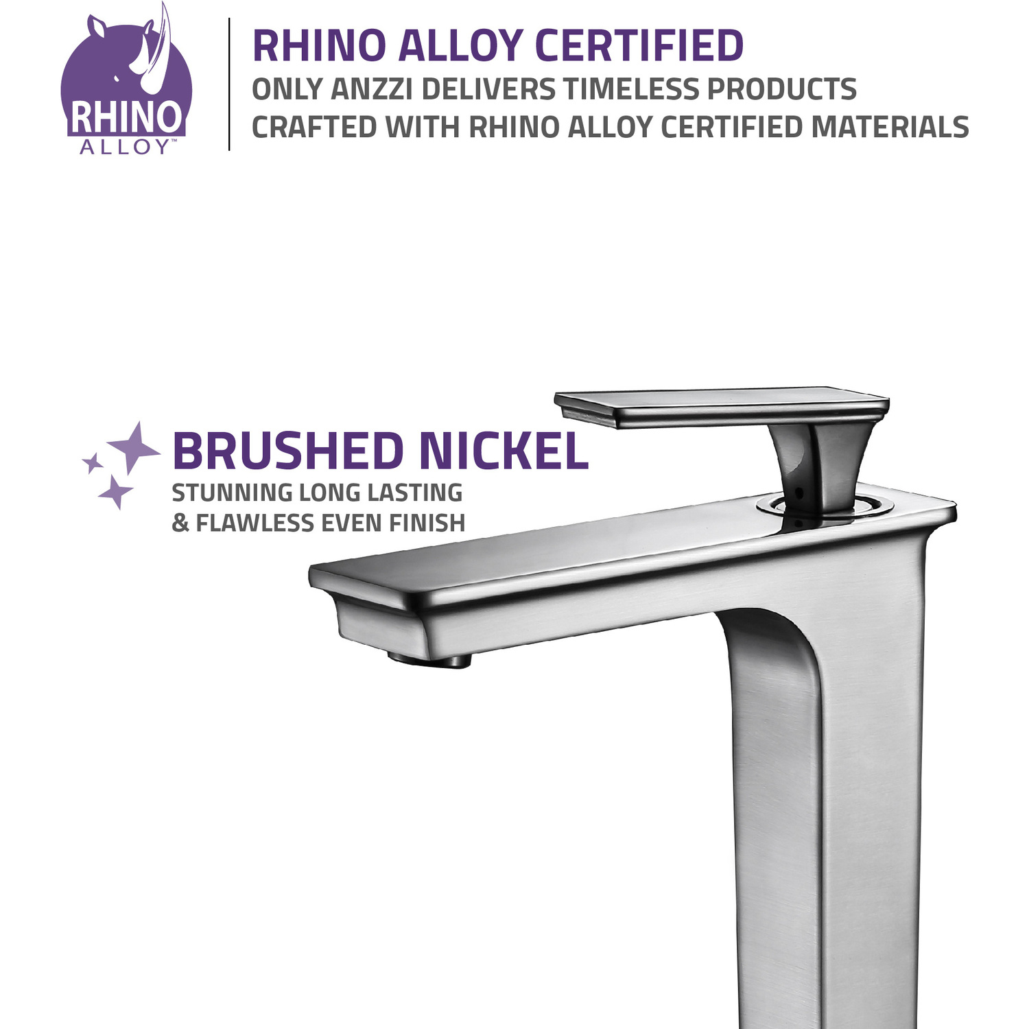 ANZZI is committed to introducing the latest in European bath fixture design to the North American home. ANZZI presents the Saunter single handle vessel sink faucet. Crafted using RHINO ALLOY certified brass interior, marine grade ceramic disk and brushed nickel lead-free rust resistant finish. The elegance and style of our ANZZI faucets is matched by their proven performance and reliability. Which is why our faucets are backed by the ANZZI Limited Lifetime Warranty. Become a member of the ANZZI family and experience why Perfection is our Tradition.Stunning brushed nickel finishRHINO ALLOY certified lead-free solid brass with rust resistant finishSingle (1) handle operationSingle (1) hole installationMarine grade ceramic disk includedSpout reach: 5.9 in.; spout height: 8.8 in.Flow rate: 1.2 gpmConnection size: 3/8 in.cUPC, NSF, AB1953 and Watersense certifiedLimited lifetime warrantyShips from factory within 24 hours of orderTo speak to a knowledgeable and dedicated ANZZI specialist simply call 1-844-44-ANZZI or visit us on the web at www.ANZZI.com