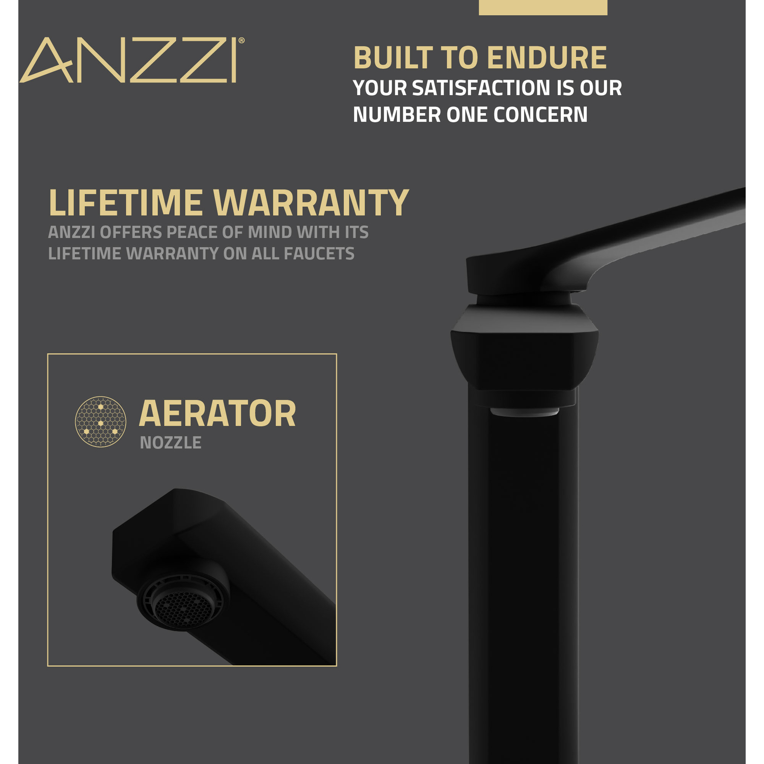 INCLUDES MATTE BLACK POP-UP DRAIN without overflow hole— faucet is ready to install out of the boxHIGH ARC SPOUT IS PERFECT FOR LARGER SINKS — delivers strong water flow that won’t splash out of the sink1.2 GPM WATER-SAVING AERATOR — uses less water while still delivering a strong flowSIMPLE SINGLE LEVER DESIGN — easily control water flow with just one handleSINGLE HOLE MOUNT — creates an uncluttered minimalist look when matched to your sinkSTRIKING MATTE BLACK FINISH — the eye-catching finish stands out and keeps looking its best year after yearDURABLE BRASS CONSTRUCTION — don’t let the elegant looks fool you, this faucet is built to lastCHIC & CONTEMPORARY STYLING — clean and crisp lines create a sleek look that adds ultra-modern allure to any bathroomRHINO-ALLOY CERTIFIED — we make sure our faucets meet the highest standards for quality and durabilityFITS MOST COMMON WATER LINES — 3/8 in. connection makes installation easy and convenientDIMENSIONS — faucet: 9.76 in. H, spout: 8.66 in. H x 8 in. L x 6.42 in. ReachLIMITED LIFETIME WARRANTY — when you buy it, we back it, so you can be confident in the quality of our productsGET IT FAST — ships from warehouse within 24 hours of order processingProfessional installation highly recommended