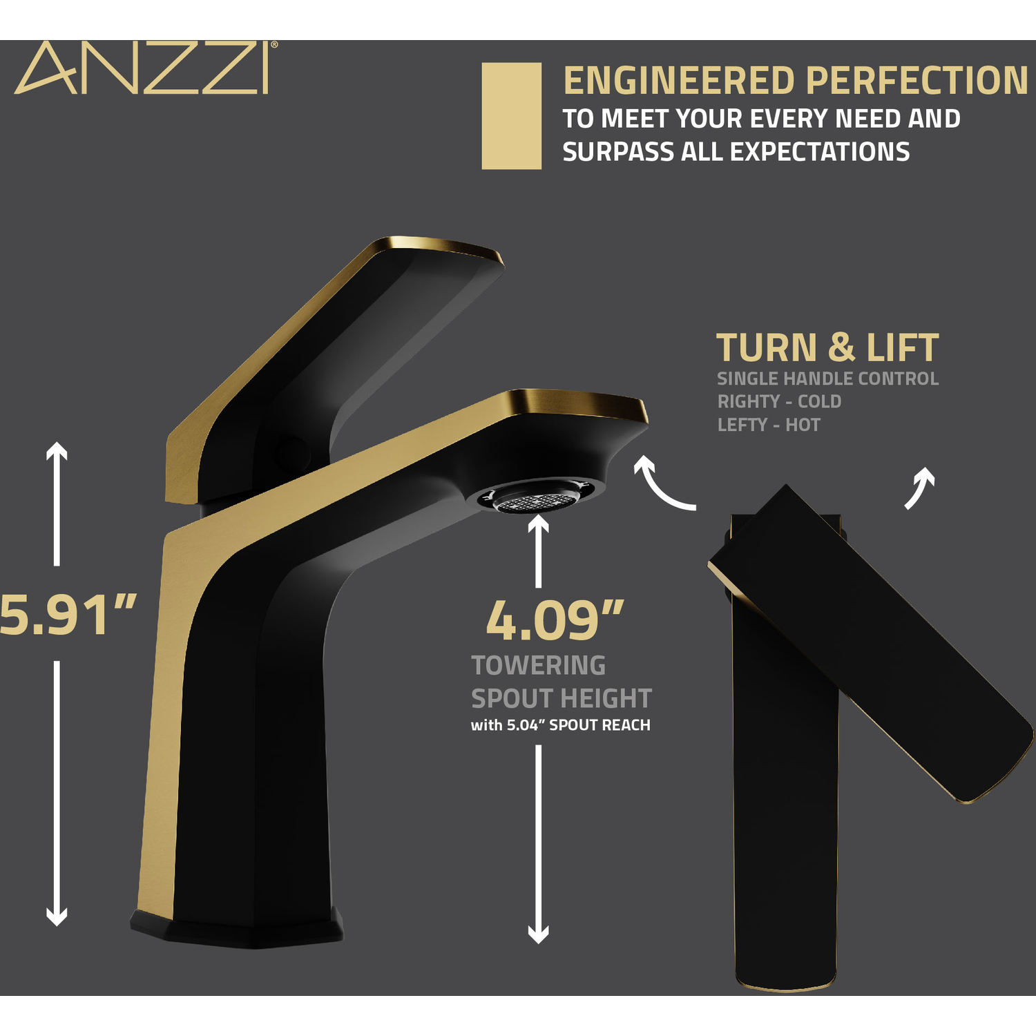 INCLUDES MATTE BLACK POP-UP DRAIN — faucet is ready to install out of the boxLOW ARC SPOUT IS PERFECT FOR SMALLER SINKS — designed to deliver a strong water flow that won’t splash out of the sink1.2 GPM WATER-SAVING AERATOR — uses less water while still delivering a strong flowSIMPLE SINGLE LEVER DESIGN — easily control water flow with just one handleSINGLE HOLE MOUNT — creates an uncluttered minimalist look when matched to your sinkSTRIKING MATTE BLACK/BRUSHED GOLD FINISH — the eye-catching finish stands out and keeps looking its best year after yearDURABLE BRASS CONSTRUCTION — don’t let the elegant looks fool you, this faucet is built to lastCHIC & CONTEMPORARY STYLING — clean and crisp lines create a sleek look that adds ultra-modern allure to any bathroomRHINO-ALLOY CERTIFIED — we make sure our faucets meet the highest standards for quality and durabilityFITS MOST COMMON WATER LINES — 3/8 in. connection makes installation easy and convenientDIMENSIONS — faucet: 5.91 in. H, spout: 4.92 in. H x 6.86 in. L x 5 in. ReachLIMITED LIFETIME WARRANTY — when you buy it, we back it, so you can be confident in the quality of our productsGET IT FAST — ships from warehouse within 24 hours of order processingProfessional installation highly recommended
