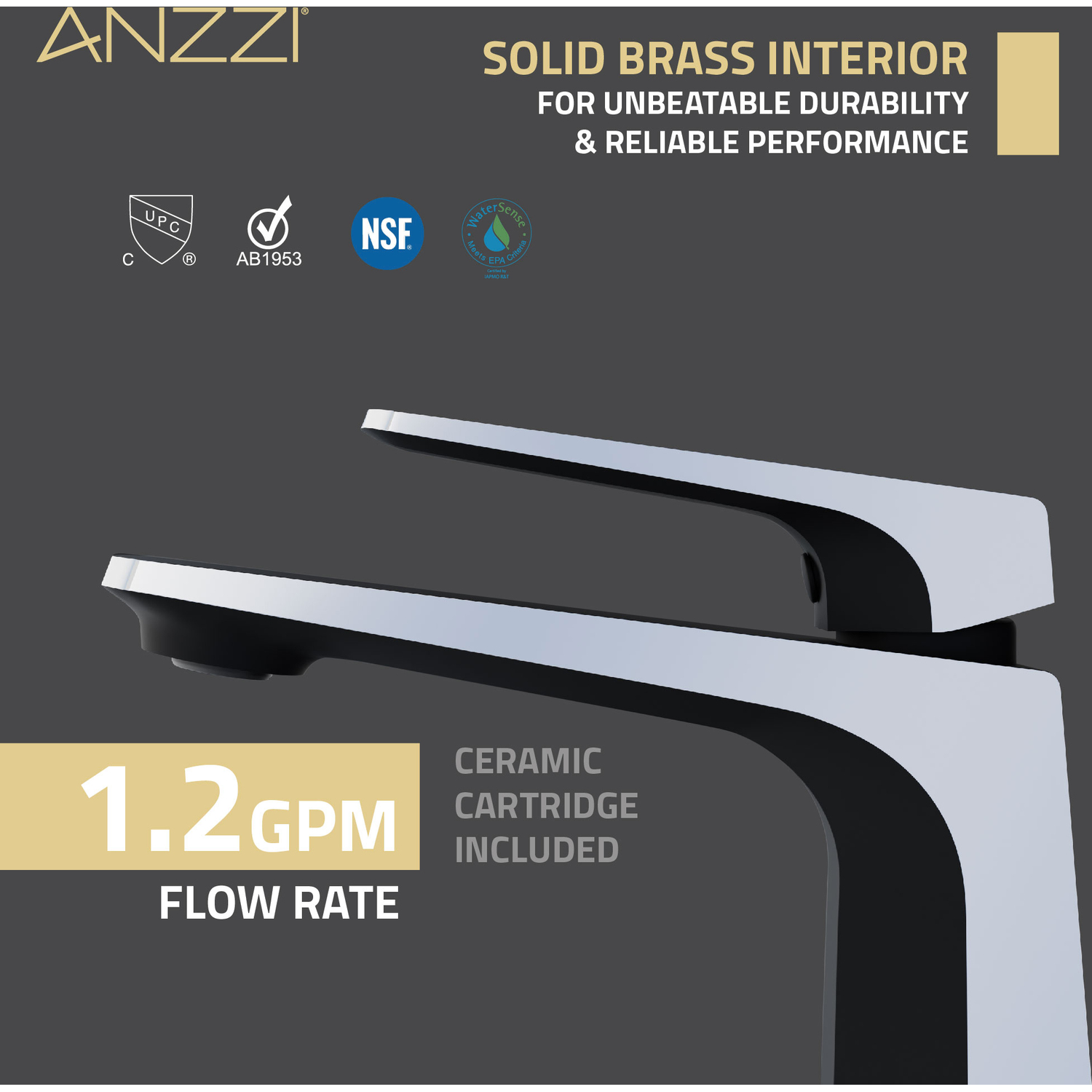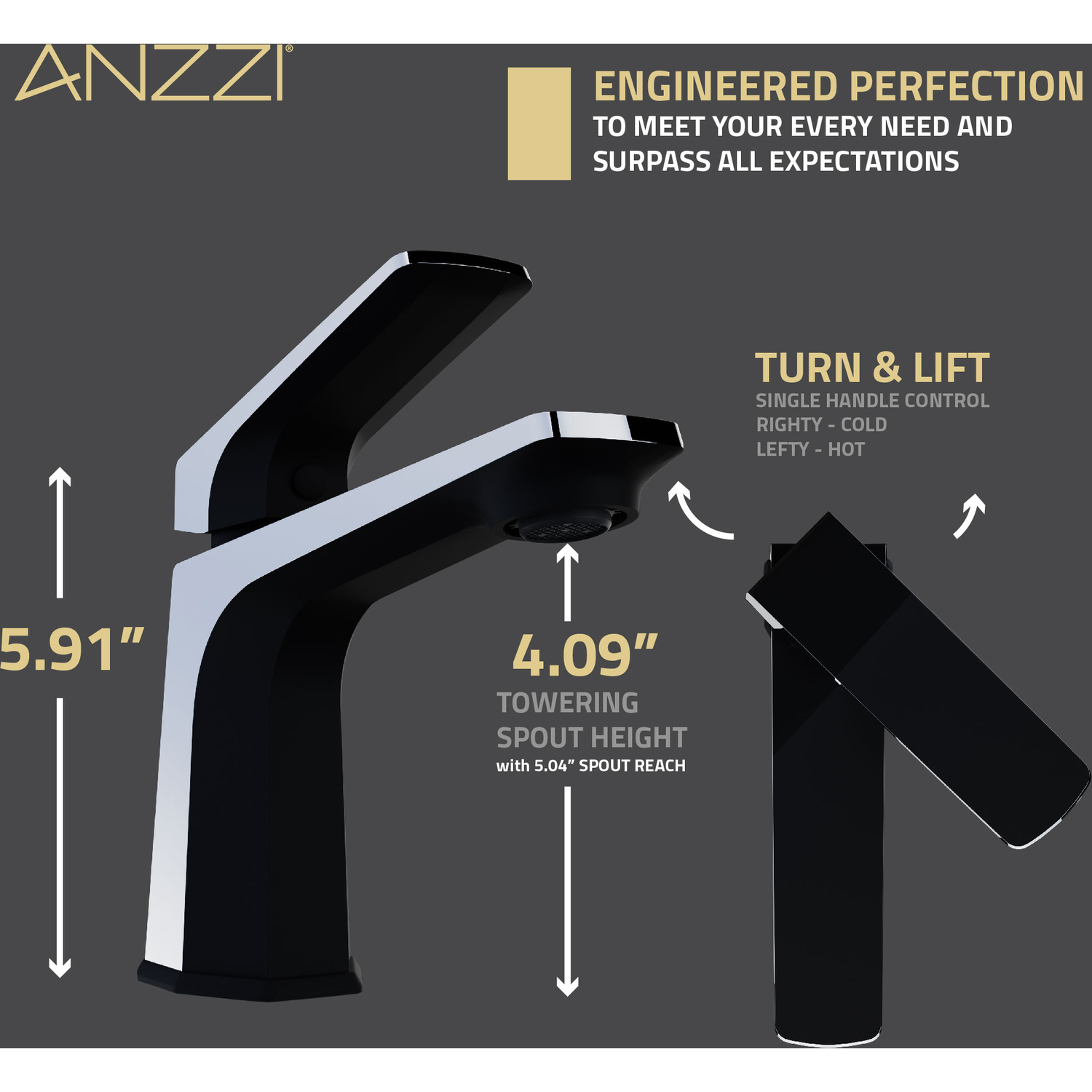 INCLUDES MATTE BLACK POP-UP DRAIN — faucet is ready to install out of the boxLOW ARC SPOUT IS PERFECT FOR SMALLER SINKS — designed to deliver a strong water flow that won’t splash out of the sink1.2 GPM WATER-SAVING AERATOR — uses less water while still delivering a strong flowSIMPLE SINGLE LEVER DESIGN — easily control water flow with just one handleSINGLE HOLE MOUNT — creates an uncluttered minimalist look when matched to your sinkSTRIKING MATTE BLACK/CHROME FINISH — the eye-catching finish stands out and keeps looking its best year after yearDURABLE BRASS CONSTRUCTION — don’t let the elegant looks fool you, this faucet is built to lastCHIC & CONTEMPORARY STYLING — clean and crisp lines create a sleek look that adds ultra-modern allure to any bathroomRHINO-ALLOY CERTIFIED — we make sure our faucets meet the highest standards for quality and durabilityFITS MOST COMMON WATER LINES — 3/8 in. connection makes installation easy and convenientDIMENSIONS — faucet: 5.91 in. H, spout: 4.92 in. H x 6.86 in. L x 5 in. ReachLIMITED LIFETIME WARRANTY — when you buy it, we back it, so you can be confident in the quality of our productsGET IT FAST — ships from warehouse within 24 hours of order processingProfessional installation highly recommended