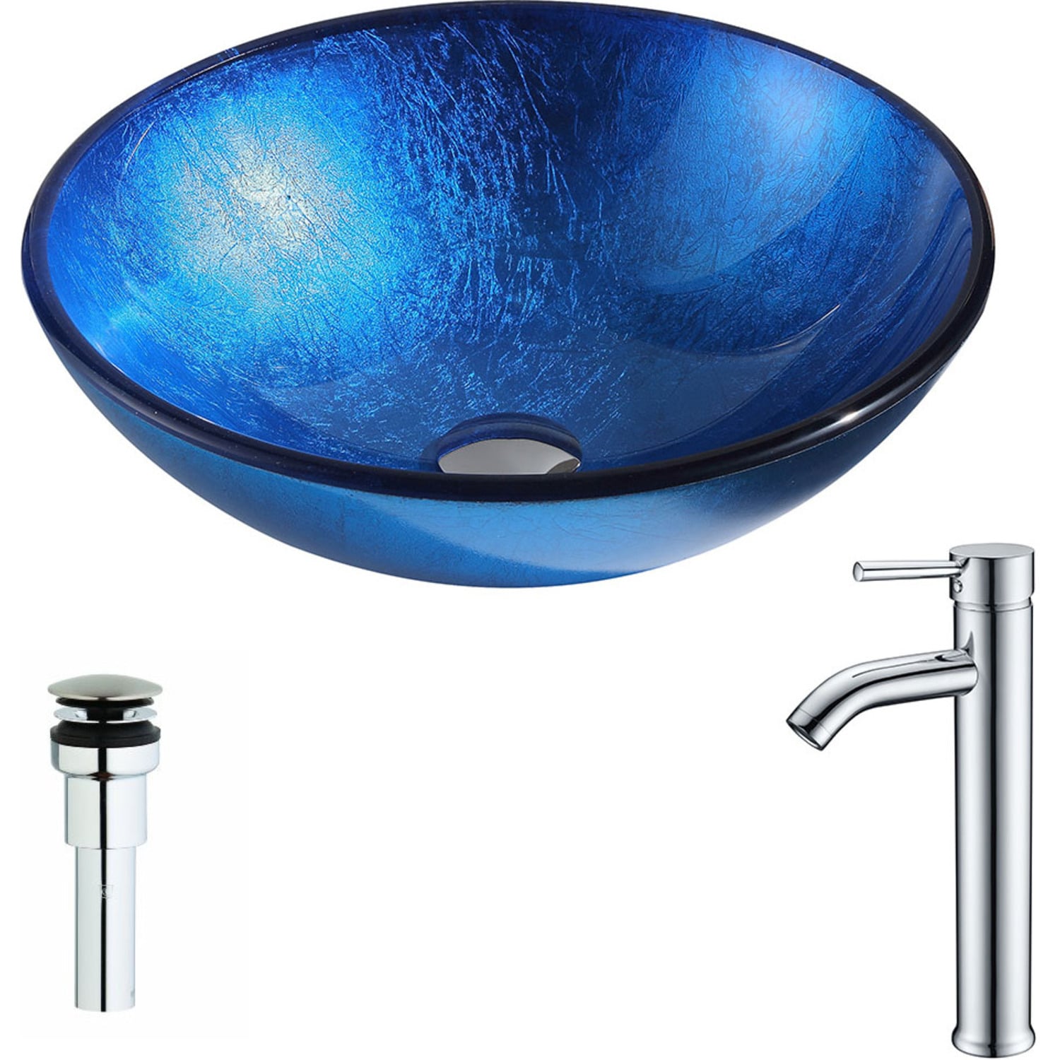 Anzzi Clavier Series Deco-Glass Vessel Sink in Lustrous Blue with Fann Faucet in Chrome, 848308086506, LSAZ027-041