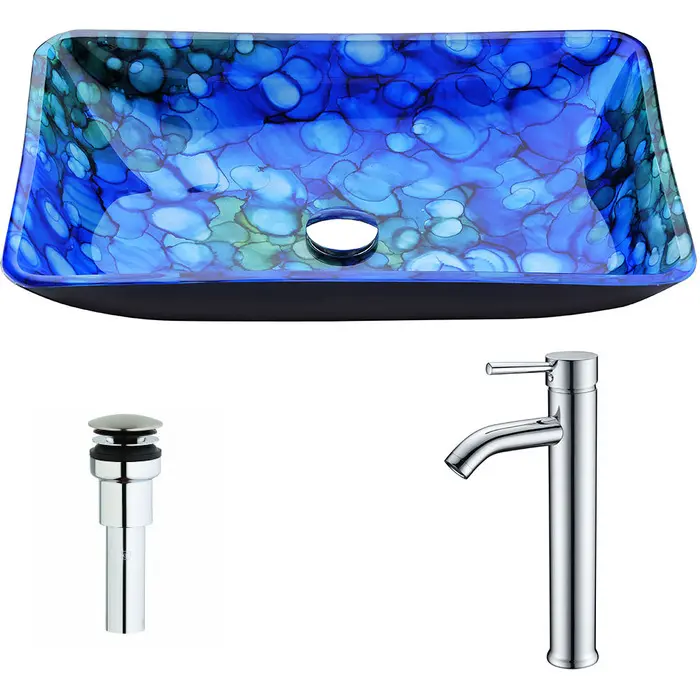 Anzzi Voce Series Deco-Glass Vessel Sink in Lustrous Blue with Fann Faucet in Chrome, 848308086360, LSAZ040-041