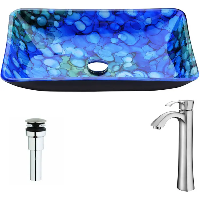 The ANZZI Voce Series sink is a traditionally crafted rectangular vessel sink adorned in a Lustrous Blue Finish. Coupled with the ANZZI Harmony Vessel Sink Faucet, this combination provides pure elegance in any bathroom. Each ANZZI vessel sink and faucet is formed using RHINO ALLOY certified materials for strength and quality along with high tempered Deco-Glass. The result is a perfectly shaped dynamically captivating vessel and faucet centerpiece for any bathroom counter.Lustrous blue finishANZZI Harmony vessel sink faucet L-AZ095BNRHINO ALLOY certified tempered deco-glass constructionScratch-tough and stain-resistant non-porous surfaceEasy-to-clean low maintenanceTop Mount installationDeco-Glass thickness 1.75 in.Dimensions: 22.5 in. L x 14.5 in. W x 4.3 in. HLimited Lifetime WarrantyTo speak to a knowledgeable and dedicated ANZZI specialist simply call 1-844-44-ANZZI or visit us on the web at www.ANZZI.com