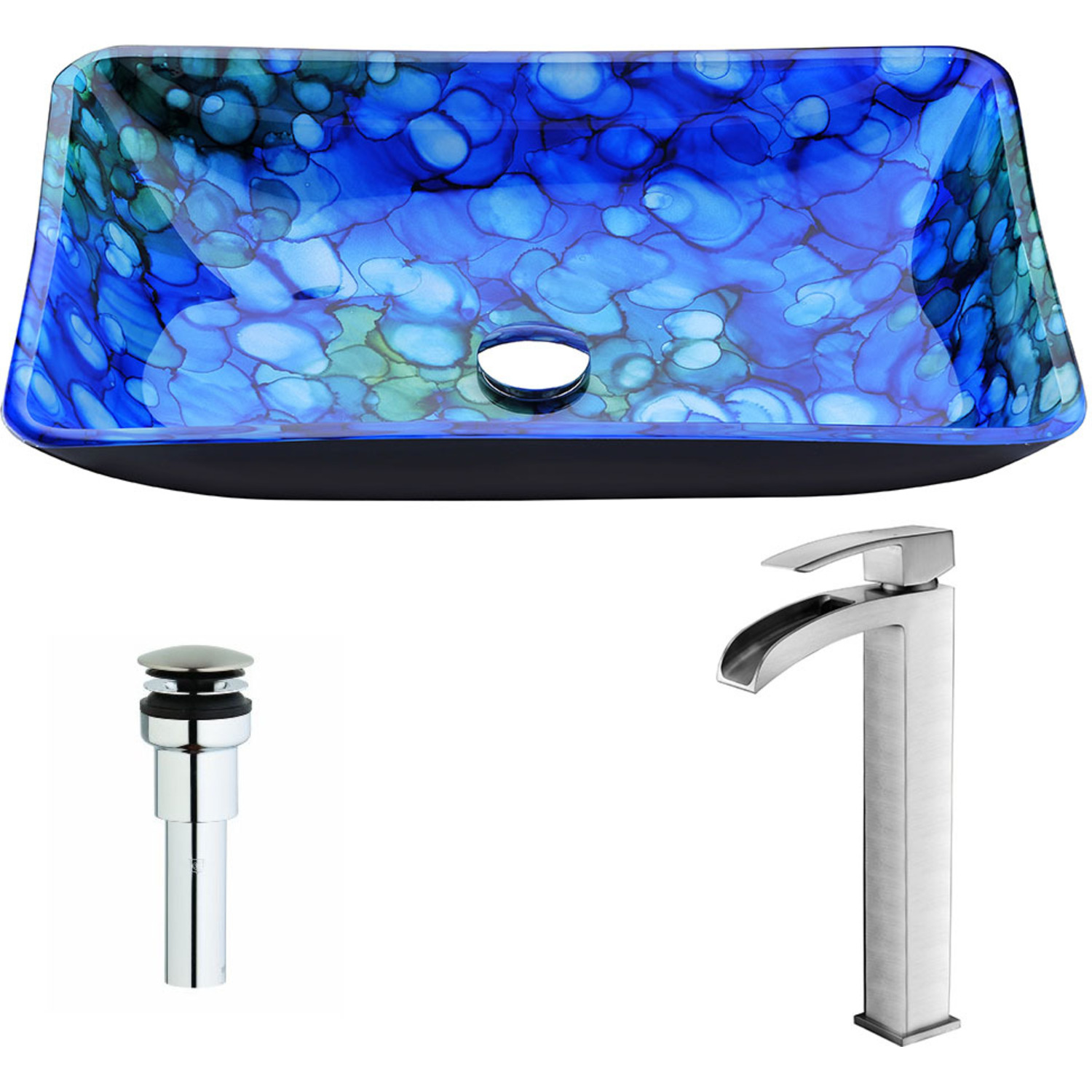 Anzzi Voce Series Deco-Glass Vessel Sink in Lustrous Blue with Key Faucet in Brushed Nickel, 848308085950, LSAZ040-097B