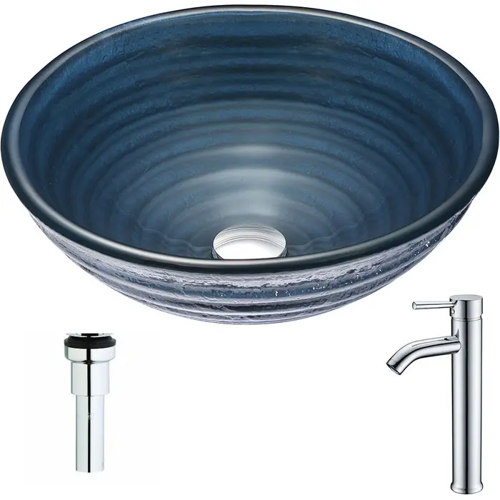 The ANZZI Tempo Series sink is a traditionally crafted round vessel sink adorned in a Coiled Blue Finish. Coupled with the ANZZI Fann Vessel Sink Faucet, this combination provides pure elegance in any bathroom. Each ANZZI vessel sink and faucet is formed using RHINO ALLOY certified materials for strength and quality along with high tempered Deco-Glass. The result is a perfectly shaped dynamically captivating vessel and faucet centerpiece for any bathroom counter.Coiled blue finishANZZI Fann vessel sink faucet L-AZ041RHINO ALLOY certified tempered deco-glass constructionScratch-tough and stain-resistant non-porous surfaceEasy-to-clean low maintenanceTop Mount installationDeco-Glass thickness 1.75 in.Dimensions: 16.75 in. L x 16.75 in. W x 6.125 in. HLimited Lifetime WarrantyTo speak to a knowledgeable and dedicated ANZZI specialist simply call 1-844-44-ANZZI or visit us on the web at www.ANZZI.com