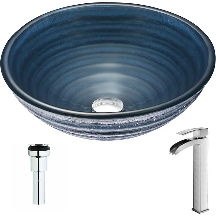 The ANZZI Tempo Series sink is a traditionally crafted round vessel sink adorned in a Coiled Blue Finish. Coupled with the ANZZI Key Vessel Sink Faucet, this combination provides pure elegance in any bathroom. Each ANZZI vessel sink and faucet is formed using RHINO ALLOY certified materials for strength and quality along with high tempered Deco-Glass. The result is a perfectly shaped dynamically captivating vessel and faucet centerpiece for any bathroom counter.Coiled blue finishANZZI Key vessel sink faucet L-AZ097BNRHINO ALLOY certified tempered deco-glass constructionScratch-tough and stain-resistant non-porous surfaceEasy-to-clean low maintenanceTop Mount installationDeco-Glass thickness 1.75 in.Dimensions: 16.75 in. L x 16.75 in. W x 6.125 in. HLimited Lifetime WarrantyTo speak to a knowledgeable and dedicated ANZZI specialist simply call 1-844-44-ANZZI or visit us on the web at www.ANZZI.com