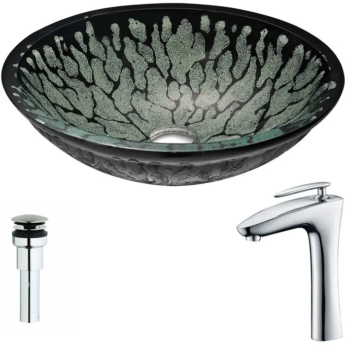 Anzzi Bravo Series Deco-Glass Vessel Sink in Lustrous Black with Crown Faucet in Chrome, 848308086667, LSAZ043-022