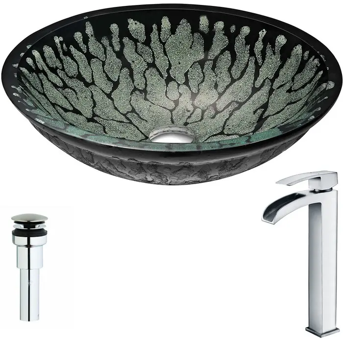 Anzzi Bravo Series Deco-Glass Vessel Sink in Lustrous Black with Key Faucet in Polished Chrome, 848308086315, LSAZ043-097