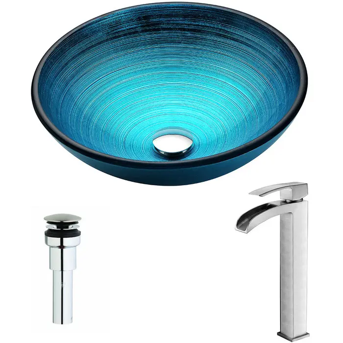 Anzzi Enti Series Deco-Glass Vessel Sink in Lustrous Blue with Key Faucet in Brushed Nickel, 848308086025, LSAZ045-097B