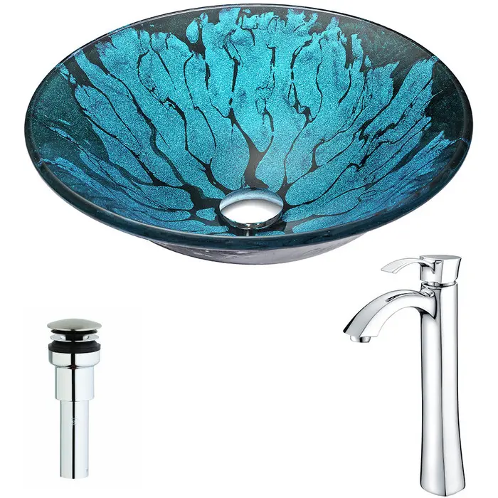 The ANZZI Key Series sink is a traditionally crafted round vessel sink adorned in a Lustrous Blue and Black Finish. Coupled with the ANZZI Harmony Vessel Sink Faucet, this combination provides pure elegance in any bathroom. Each ANZZI vessel sink and faucet is formed using RHINO ALLOY certified materials for strength and quality along with high tempered Deco-Glass. The result is a perfectly shaped dynamically captivating vessel and faucet centerpiece for any bathroom counter.Lustrous blue and black finishANZZI Harmony vessel sink faucet L-AZ095RHINO ALLOY certified tempered deco-glass constructionScratch-tough and stain-resistant non-porous surfaceEasy-to-clean low maintenanceTop Mount installationDimensions: 17.25 in. L x 17.25 in. W x 5.5 in. HDeco-Glass thickness 1/2 in.Single 3/4 in. standard drain openingTo speak to a knowledgeable and dedicated ANZZI specialist simply call 1-844-44-ANZZI or visit us on the web at www.ANZZI.com