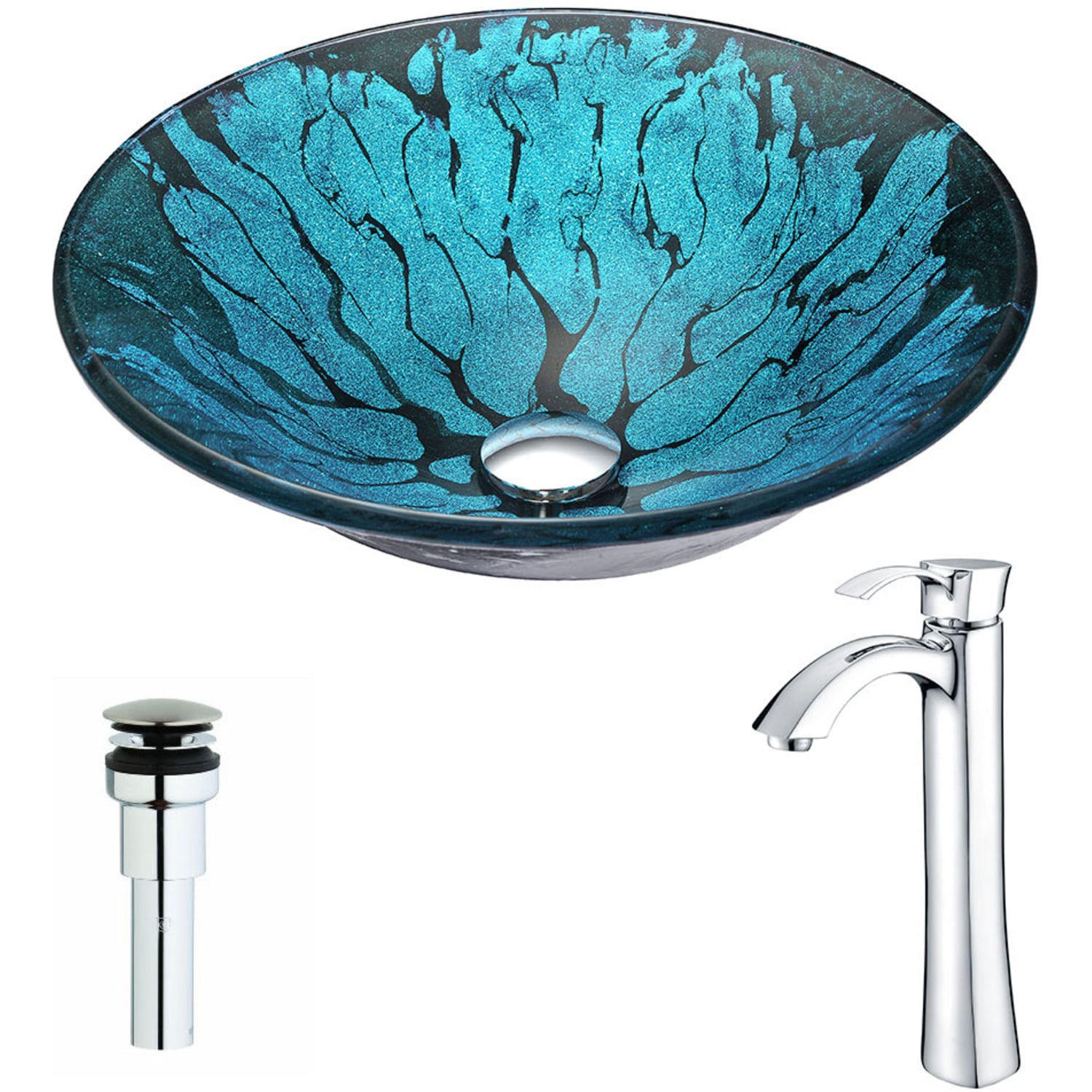 Anzzi Key Series Deco-Glass Vessel Sink in Lustrous Blue and Black with Harmony Faucet in Chrome, 848308085363, LSAZ046-095