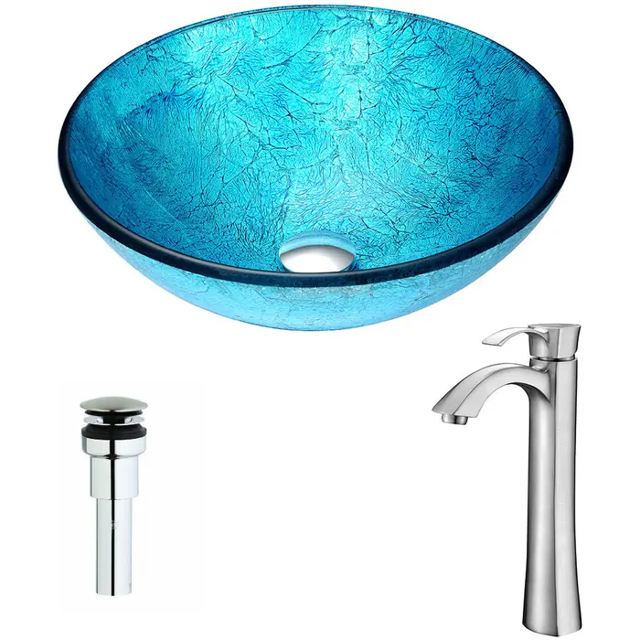 Anzzi Accent Series Deco-Glass Vessel Sink in Blue Ice with Harmony Faucet in Brushed Nickel, 848308083581, LSAZ047-095B