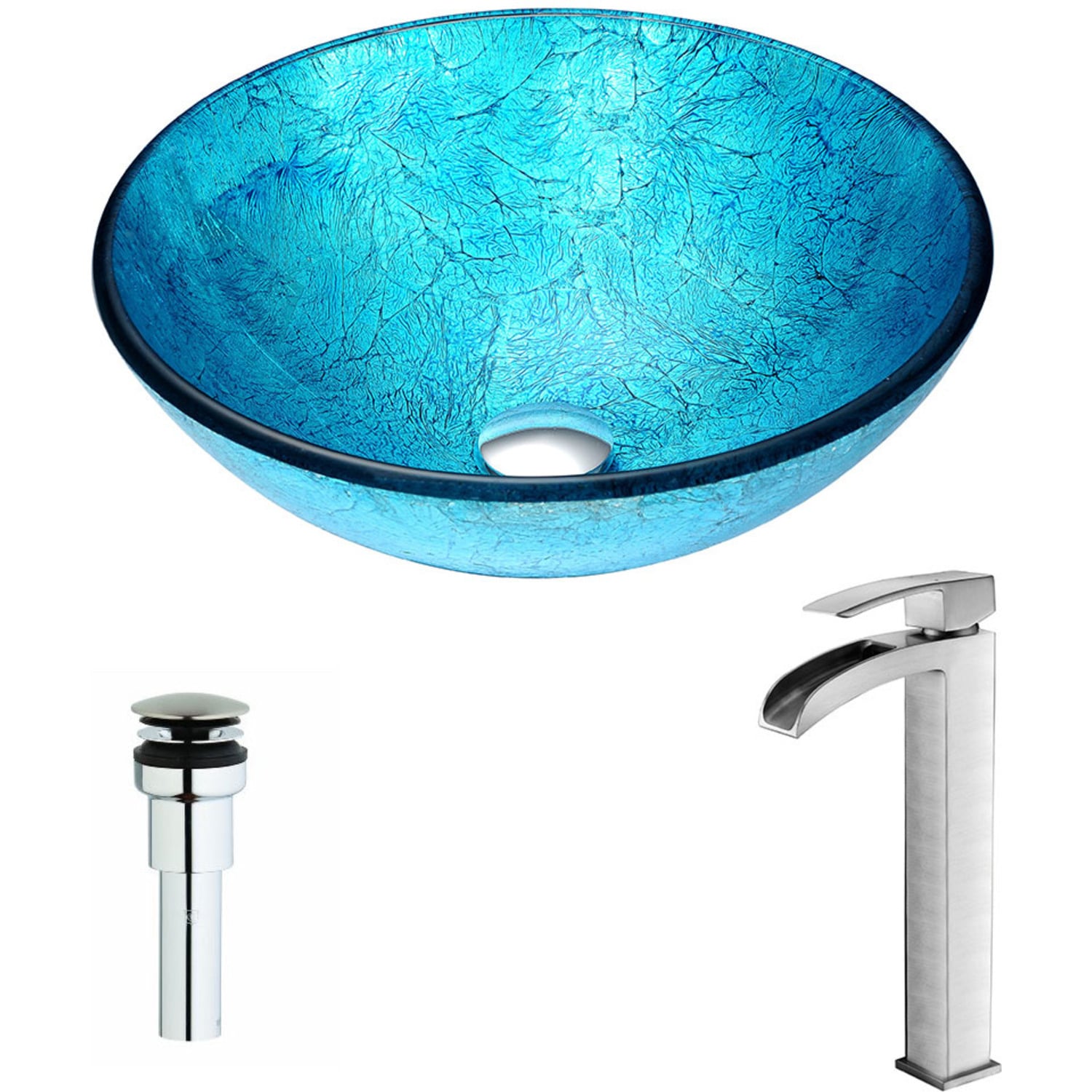 Anzzi Accent Series Deco-Glass Vessel Sink in Blue Ice with Key Faucet in Brushed Nickel, 848308086001, LSAZ047-097B