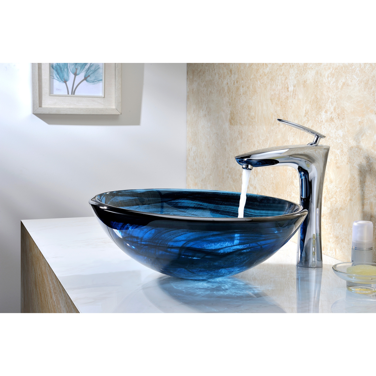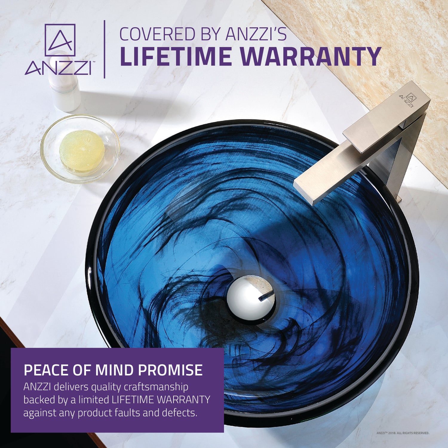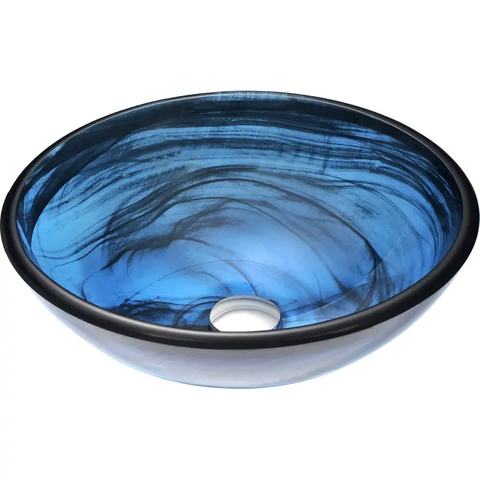 The ANZZI Soave Series sink is a traditionally crafted round vessel sink adorned in a Sapphire Wisp Finish. Each ANZZI vessel sink is formed using RHINO ALLOY certified high tempered Deco-Glass material. The result is a dynamically shaped and captivating vessel centerpiece for any bathroom counter.Sapphire Wisp FinishRHINO ALLOY certified Tempered Deco-Glass constructionScratch-tough and stain-resistant non-porous surfaceEasy-to-clean low maintenanceTop Mount installationDeco-Glass thickness 1.75 in.Single 1.75 in. standard drain openingLimited Lifetime WarrantyTo speak to a knowledgeable and dedicated ANZZI specialist simply call 1-844-44-ANZZI or visit us on the web at www.ANZZI.comAdditionally, use the following codes to search for exquisite vessel faucet options from ANZZI: L-AZ022 , L-AZ095 , L-AZ095BN , L-AZ096 , L-AZ096BN , L-AZ097 , L-AZ097BN , L-AZ040 , L-AZ041