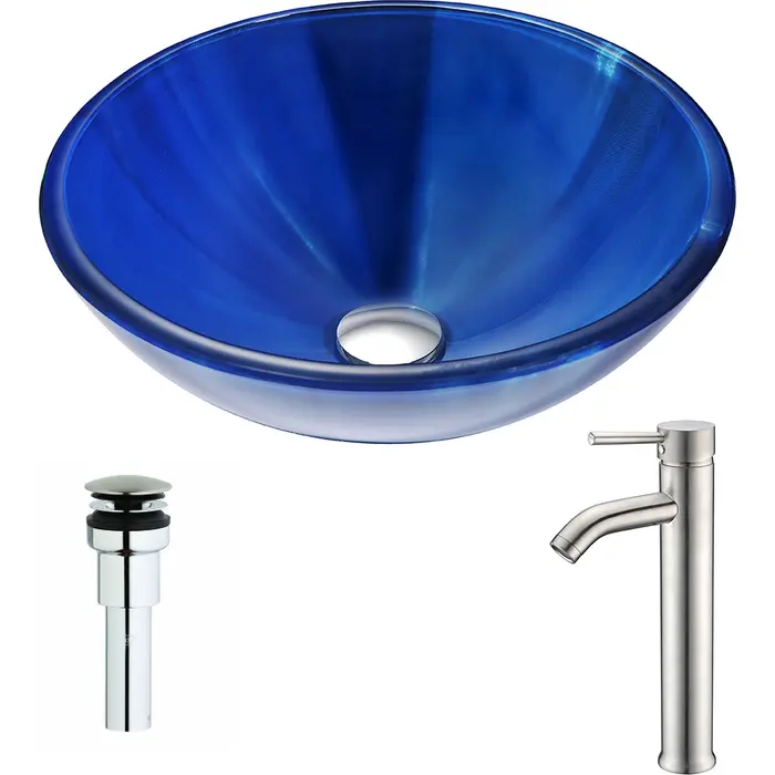 Anzzi Meno Series Deco-Glass Vessel Sink in Lustrous Blue with Fann Faucet in Brushed Nickel, 848308084687, LSAZ051-040