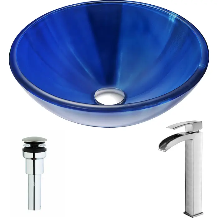 Anzzi Meno Series Deco-Glass Vessel Sink in Lustrous Blue with Key Faucet in Brushed Nickel, 848308086032, LSAZ051-097B
