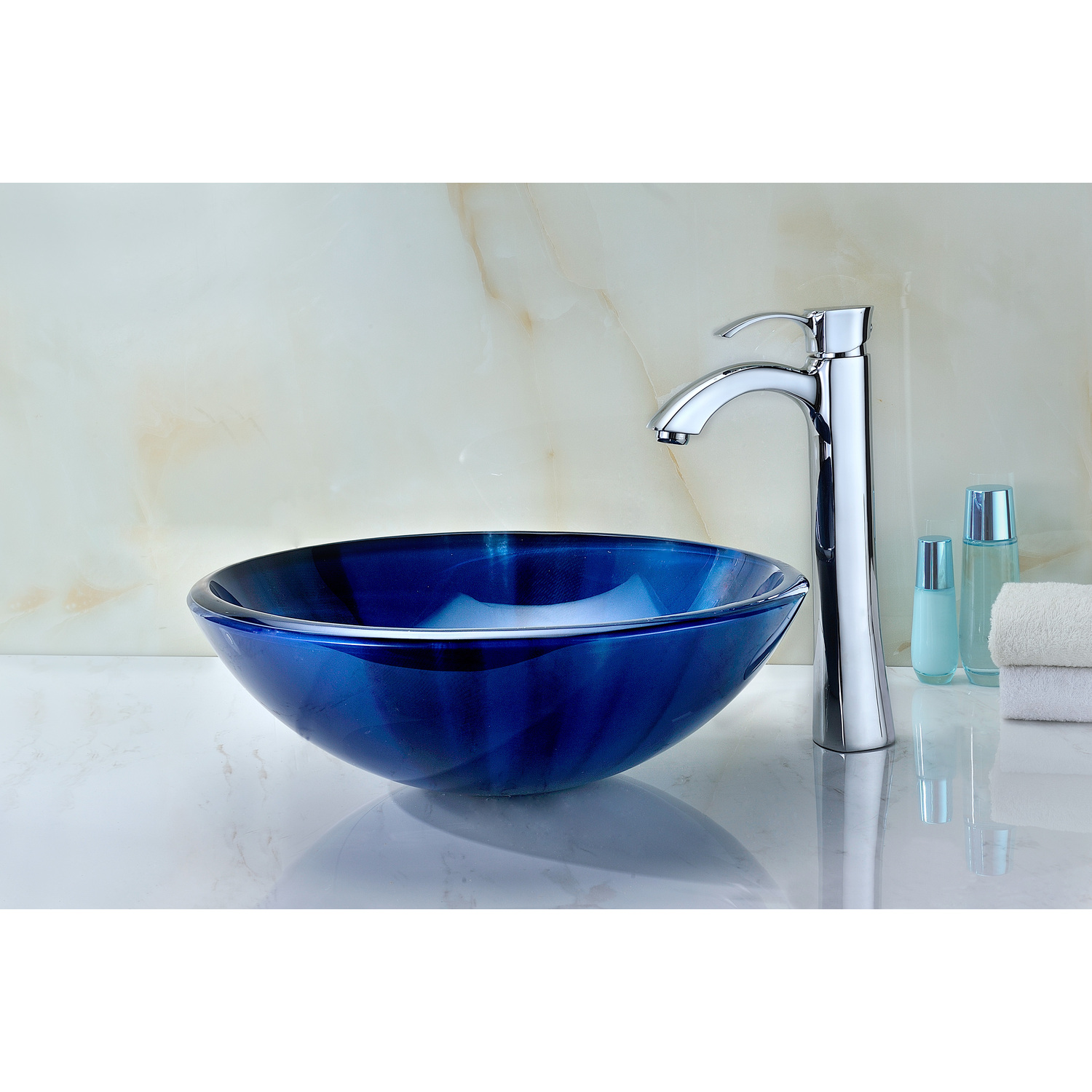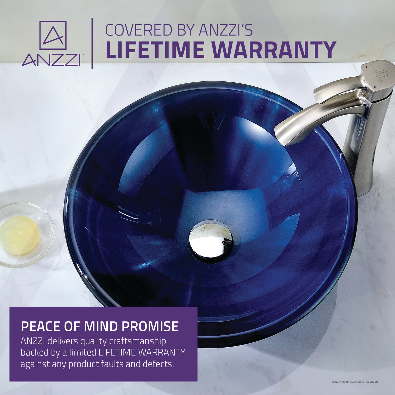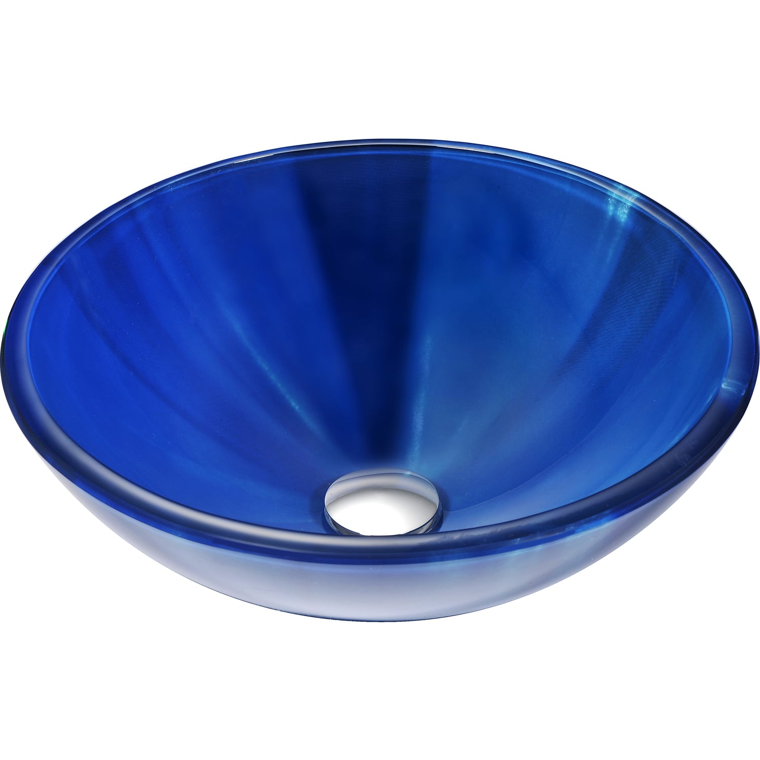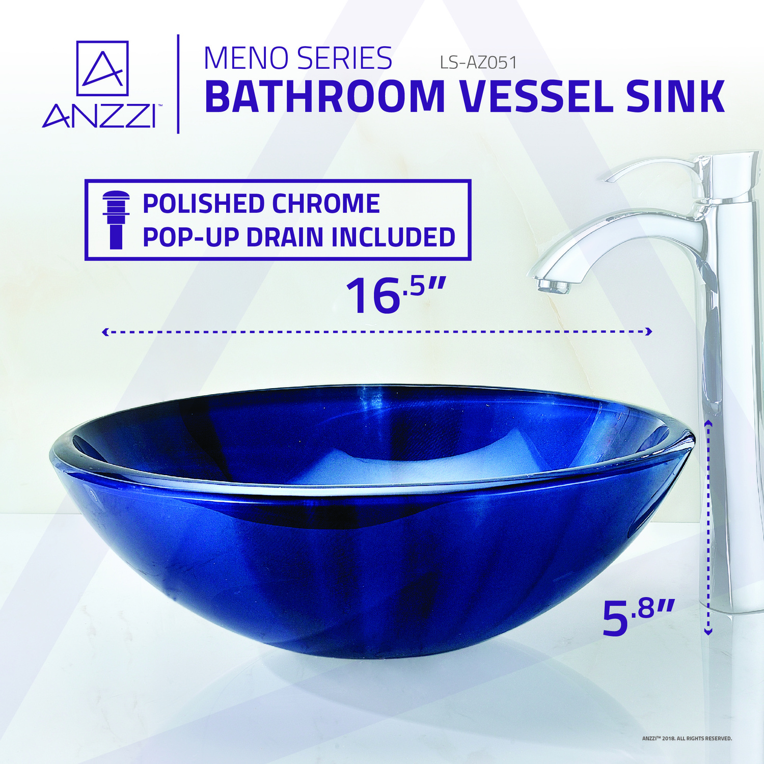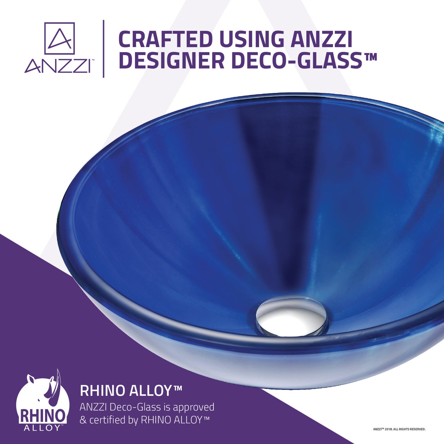 The ANZZI Meno Series sink is a traditionally crafted round vessel sink adorned in a Lustrous Blue Finish. Each ANZZI vessel sink is formed using RHINO ALLOY certified high tempered Deco-Glass material. The result is a dynamically shaped and captivating vessel centerpiece for any bathroom counter.Lustrous Blue FinishRHINO ALLOY certified Tempered Deco-Glass constructionScratch-tough and stain-resistant non-porous surfaceEasy-to-clean low maintenanceTop Mount installationDimensions: 16.5 in. L x 16.5 in. W x 5.875 in. HDeco-Glass thickness 1.75 in.Single 1.75 in. standard drain openingLimited Lifetime WarrantyTo speak to a knowledgeable and dedicated ANZZI specialist simply call 1-844-44-ANZZI or visit us on the web at www.ANZZI.comAdditionally, use the following codes to search for exquisite vessel faucet options from ANZZI: L-AZ022 , L-AZ095 , L-AZ095BN , L-AZ096 , L-AZ096BN , L-AZ097 , L-AZ097BN , L-AZ040 , L-AZ041