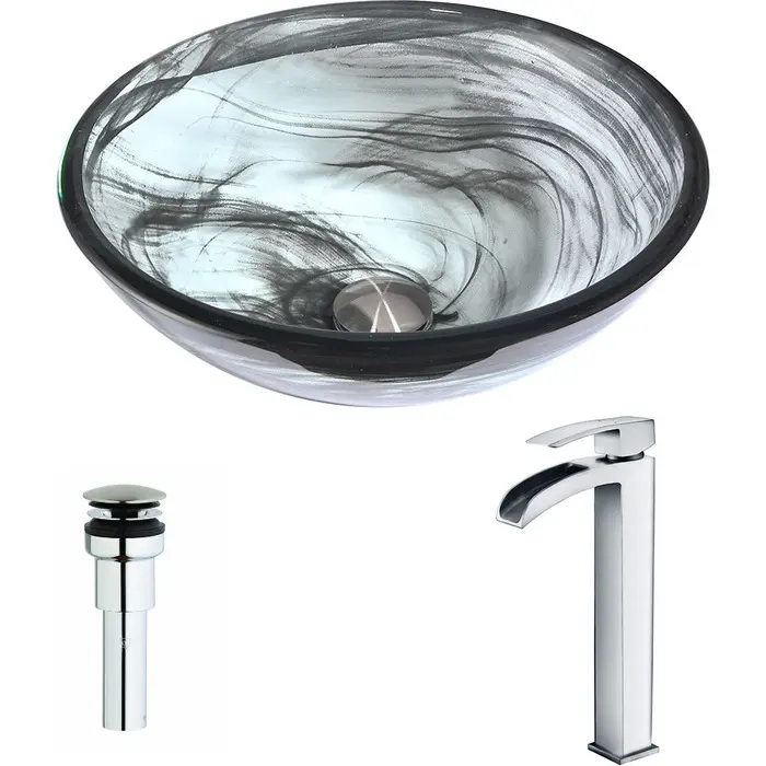 Anzzi Mezzo Series Deco-Glass Vessel Sink in Slumber Wisp with Key Faucet in Polished Chrome, 848308085837, LSAZ054-097