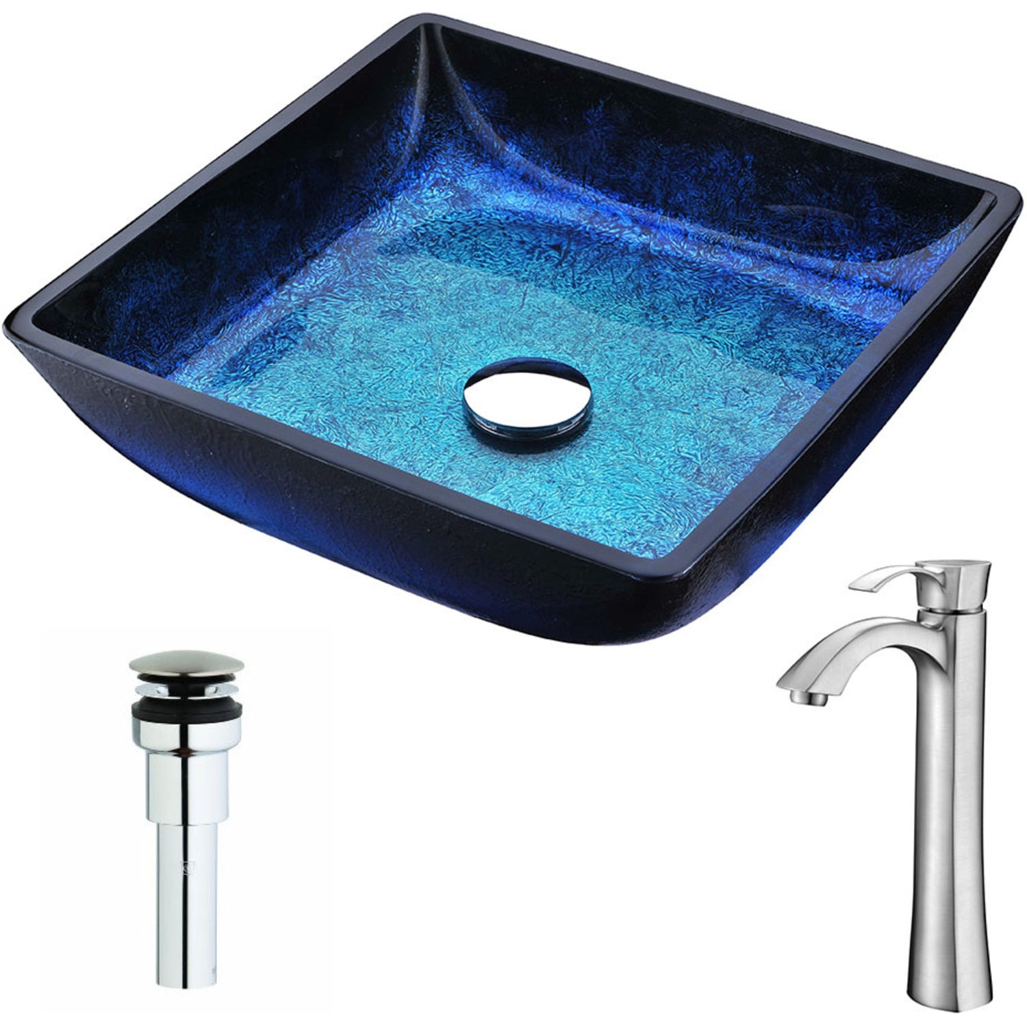 The ANZZI Viace Series sink is a traditionally crafted squared vessel sink adorned in a Blazing Blue Finish. Coupled with the ANZZI Harmony Vessel Sink Faucet, this combination provides pure elegance in any bathroom. Each ANZZI vessel sink and faucet is formed using RHINO ALLOY certified materials for strength and quality along with high tempered Deco-Glass. The result is a perfectly shaped dynamically captivating vessel and faucet centerpiece for any bathroom counter.Blazing blue finishANZZI Harmony vessel sink faucet L-AZ095BNRHINO ALLOY certified tempered deco-glass constructionScratch-tough and stain-resistant non-porous surfaceEasy-to-clean low maintenanceTop Mount installationDeco-Glass thickness 1.75 in.Dimensions: 15.125 in. L x 15.125 in. W x 4 in. HLimited Lifetime WarrantyTo speak to a knowledgeable and dedicated ANZZI specialist simply call 1-844-44-ANZZI or visit us on the web at www.ANZZI.com