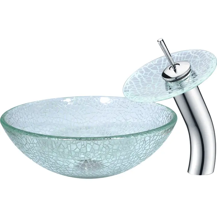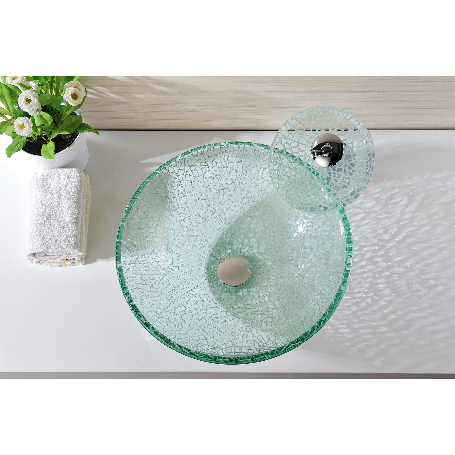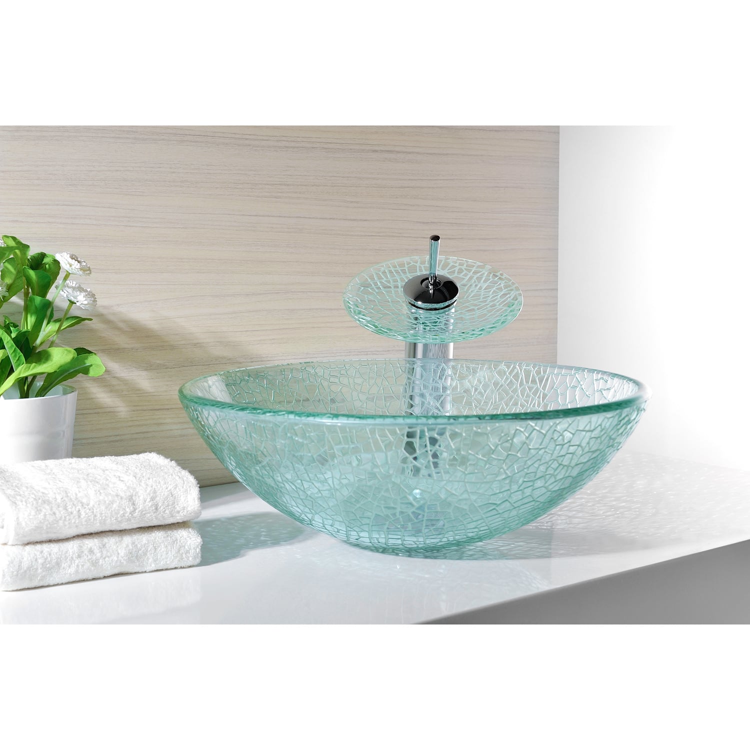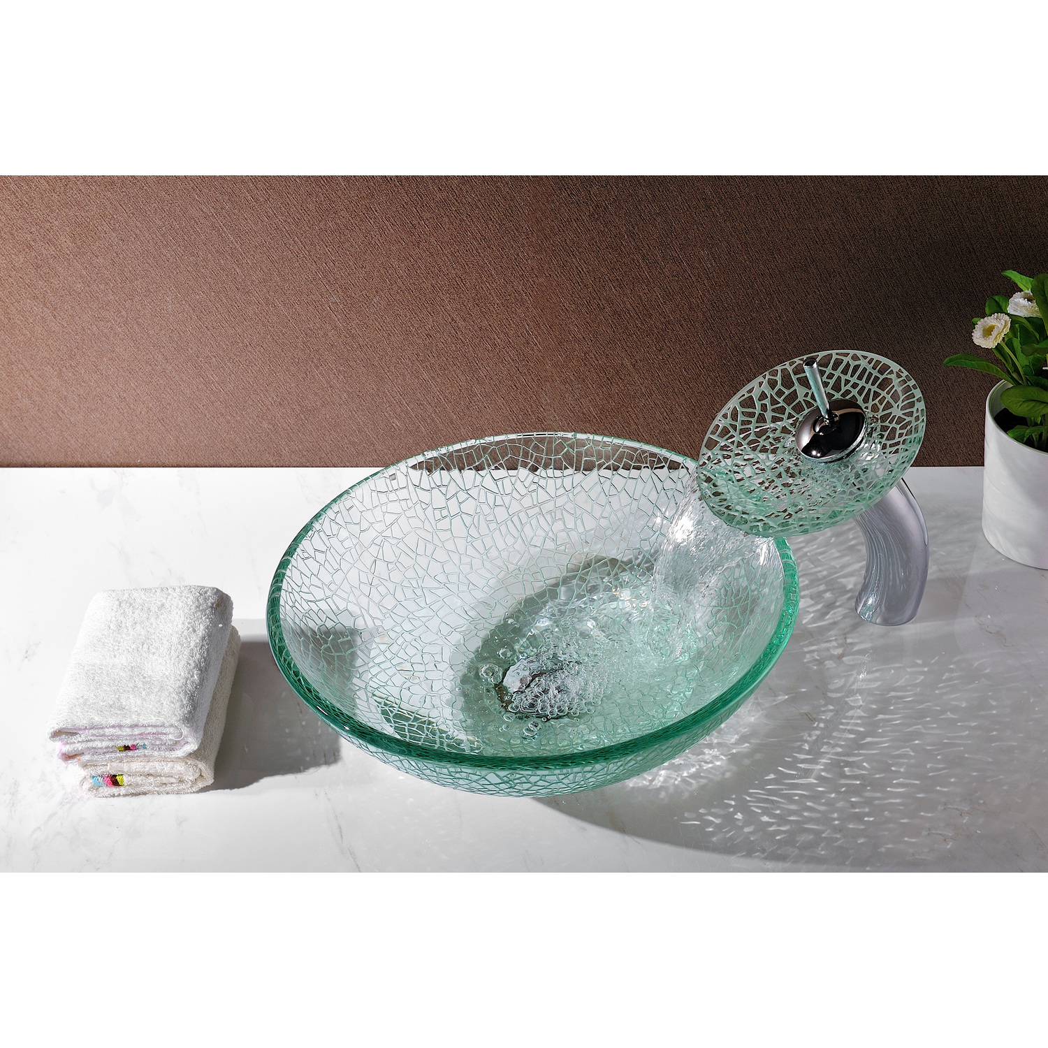 The ANZZI Choir Series sink is a traditionally crafted round vessel sink adorned in a Crystal Clear Mosaic Finish. Each ANZZI vessel sink is formed using RHINO ALLOY certified high tempered Deco-Glass material. Additionally a matching Deco-Glass and chrome single handle waterfall faucet is bundled with vessel sink as a set. The result is a dynamically shaped and captivating vessel centerpiece for any bathroom counter.Crystal Clear Mosaic FinishRHINO ALLOY certified Tempered Deco-Glass constructionScratch-tough and stain-resistant non-porous surfaceEasy-to-clean low maintenanceTop Mount installationDimensions: 16.5 in. L x 16.5 in. W x 5.75 in. HSingle handle matching Deco-Glass waterfall vessel faucet in chrome finish includedDeco-Glass thickness 1.75 in.Ships from factory within 24 hours once order is processedLifetime WarrantyTo speak to a knowledgeable and dedicated ANZZI specialist simply call 1-844-44-ANZZI or visit us on the web at www.ANZZI.comUse the following codes to search for additional vessel faucet options from ANZZI: L-AZ022 , L-AZ095 , L-AZ095BN , L-AZ096 , L-AZ096BN , L-AZ097 , L-AZ097BN , L-AZ040 , L-AZ041