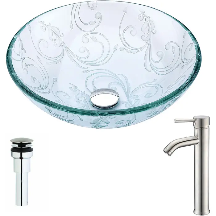 Anzzi Vieno Series Deco-Glass Vessel Sink in Crystal Clear Floral with Fann Faucet in Brushed Nickel, 848308083338, LSAZ065-040