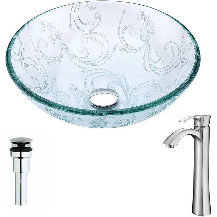 The ANZZI Vieno Series sink is a traditionally crafted round vessel sink adorned in a Crystal Clear Floral Finish. Coupled with the ANZZI Harmony Vessel Sink Faucet, this combination provides pure elegance in any bathroom. Each ANZZI vessel sink and faucet is formed using RHINO ALLOY certified materials for strength and quality along with high tempered Deco-Glass. The result is a perfectly shaped dynamically captivating vessel and faucet centerpiece for any bathroom counter.Crystal clear floral finishANZZI Harmony vessel sink faucet L-AZ095BNRHINO ALLOY certified tempered deco-glass constructionScratch-tough and stain-resistant non-porous surfaceEasy-to-clean low maintenanceTop Mount installationDeco-Glass thickness 1.75 in.Dimensions: 16.5 in. L x 16.5 in. W x 5.5 in. HLimited Lifetime WarrantyTo speak to a knowledgeable and dedicated ANZZI specialist simply call 1-844-44-ANZZI or visit us on the web at www.ANZZI.com