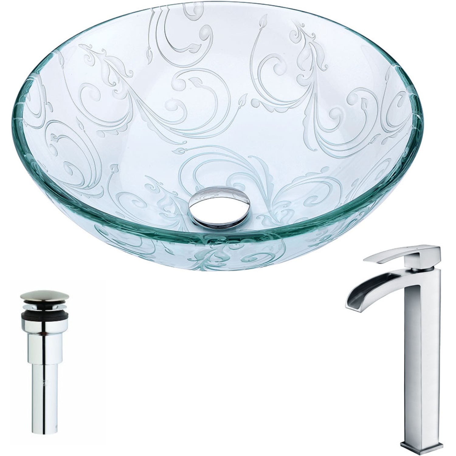 Anzzi Vieno Series Deco-Glass Vessel Sink in Crystal Clear Floral with Key Faucet in Polished Chrome, 848308086254, LSAZ065-097