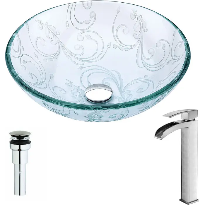 The ANZZI Vieno Series sink is a traditionally crafted round vessel sink adorned in a Crystal Clear Floral Finish. Coupled with the ANZZI Key Vessel Sink Faucet, this combination provides pure elegance in any bathroom. Each ANZZI vessel sink and faucet is formed using RHINO ALLOY certified materials for strength and quality along with high tempered Deco-Glass. The result is a perfectly shaped dynamically captivating vessel and faucet centerpiece for any bathroom counter.Crystal clear floral finishANZZI Key vessel sink faucet L-AZ097BNRHINO ALLOY certified tempered deco-glass constructionScratch-tough and stain-resistant non-porous surfaceEasy-to-clean low maintenanceTop Mount installationDeco-Glass thickness 1.75 in.Dimensions: 16.5 in. L x 16.5 in. W x 5.5 in. HLimited Lifetime WarrantyTo speak to a knowledgeable and dedicated ANZZI specialist simply call 1-844-44-ANZZI or visit us on the web at www.ANZZI.com