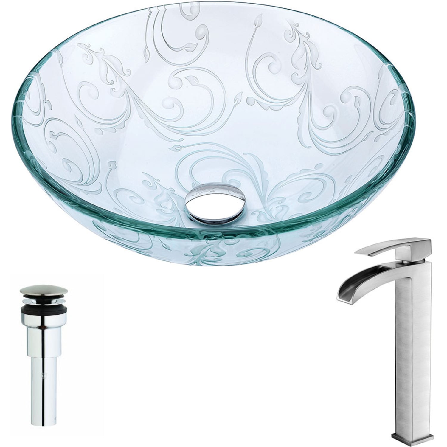 Anzzi Vieno Series Deco-Glass Vessel Sink in Crystal Clear Floral with Key Faucet in Brushed Nickel, 848308085851, LSAZ065-097B