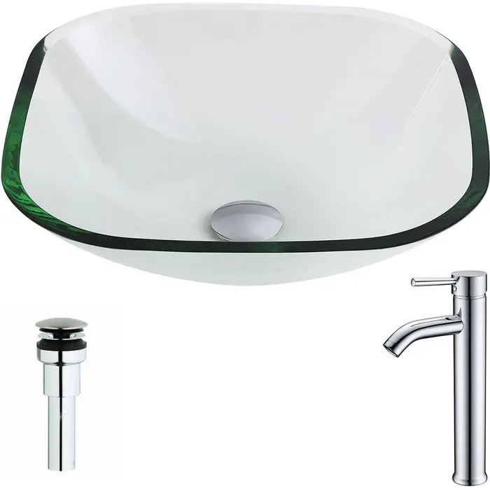 The ANZZI Cadenza Series sink is a traditionally crafted squared vessel sink adorned in a Lustrous Clear Finish. Coupled with the ANZZI Fann Vessel Sink Faucet, this combination provides pure elegance in any bathroom. Each ANZZI vessel sink and faucet is formed using RHINO ALLOY certified materials for strength and quality along with high tempered Deco-Glass. The result is a perfectly shaped dynamically captivating vessel and faucet centerpiece for any bathroom counter.Lustrous clear finishANZZI Fann vessel sink faucet L-AZ041RHINO ALLOY certified tempered deco-glass constructionScratch-tough and stain-resistant non-porous surfaceEasy-to-clean low maintenanceTop Mount installationDeco-Glass thickness 1.75 in.Dimensions: 16.5 in. L x 16.625 in. W x 5 in. HLimited Lifetime WarrantyTo speak to a knowledgeable and dedicated ANZZI specialist simply call 1-844-44-ANZZI or visit us on the web at www.ANZZI.com