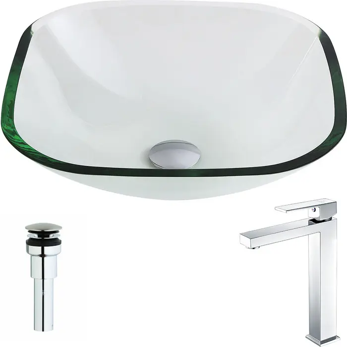 The ANZZI Cadenza Series sink is a traditionally crafted squared vessel sink adorned in a Lustrous Clear Finish. Coupled with the ANZZI Enti Vessel Sink Faucet, this combination provides pure elegance in any bathroom. Each ANZZI vessel sink and faucet is formed using RHINO ALLOY certified materials for strength and quality along with high tempered Deco-Glass. The result is a perfectly shaped dynamically captivating vessel and faucet centerpiece for any bathroom counter.Lustrous clear finishANZZI Enti vessel sink faucet L-AZ096RHINO ALLOY certified tempered deco-glass constructionScratch-tough and stain-resistant non-porous surfaceEasy-to-clean low maintenanceTop Mount installationDeco-Glass thickness 1.75 in.Dimensions: 16.5 in. L x 16.625 in. W x 5 in. HLimited Lifetime WarrantyTo speak to a knowledgeable and dedicated ANZZI specialist simply call 1-844-44-ANZZI or visit us on the web at www.ANZZI.com