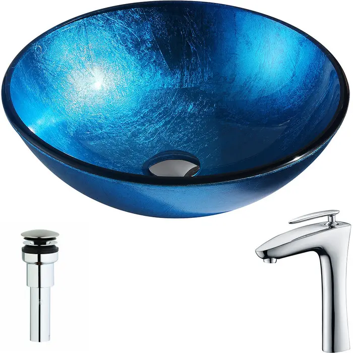 The ANZZI Arc Series sink is a traditionally crafted round vessel sink adorned in a Lustrous Light Blue Finish. Coupled with the ANZZI Crown Vessel Sink Faucet, this combination provides pure elegance in any bathroom. Each ANZZI vessel sink and faucet is formed using RHINO ALLOY certified materials for strength and quality along with high tempered Deco-Glass. The result is a perfectly shaped dynamically captivating vessel and faucet centerpiece for any bathroom counter.Lustrous light blue finishANZZI Crown vessel sink faucet L-AZ022RHINO ALLOY certified tempered deco-glass constructionScratch-tough and stain-resistant non-porous surfaceEasy-to-clean low maintenanceTop Mount installationDimensions: 16.5 in. L x 16.5 in. W x 5.5 in. HDeco-Glass thickness 1/2 in.Single 3/4 in. standard drain openingTo speak to a knowledgeable and dedicated ANZZI specialist simply call 1-844-44-ANZZI or visit us on the web at www.ANZZI.com