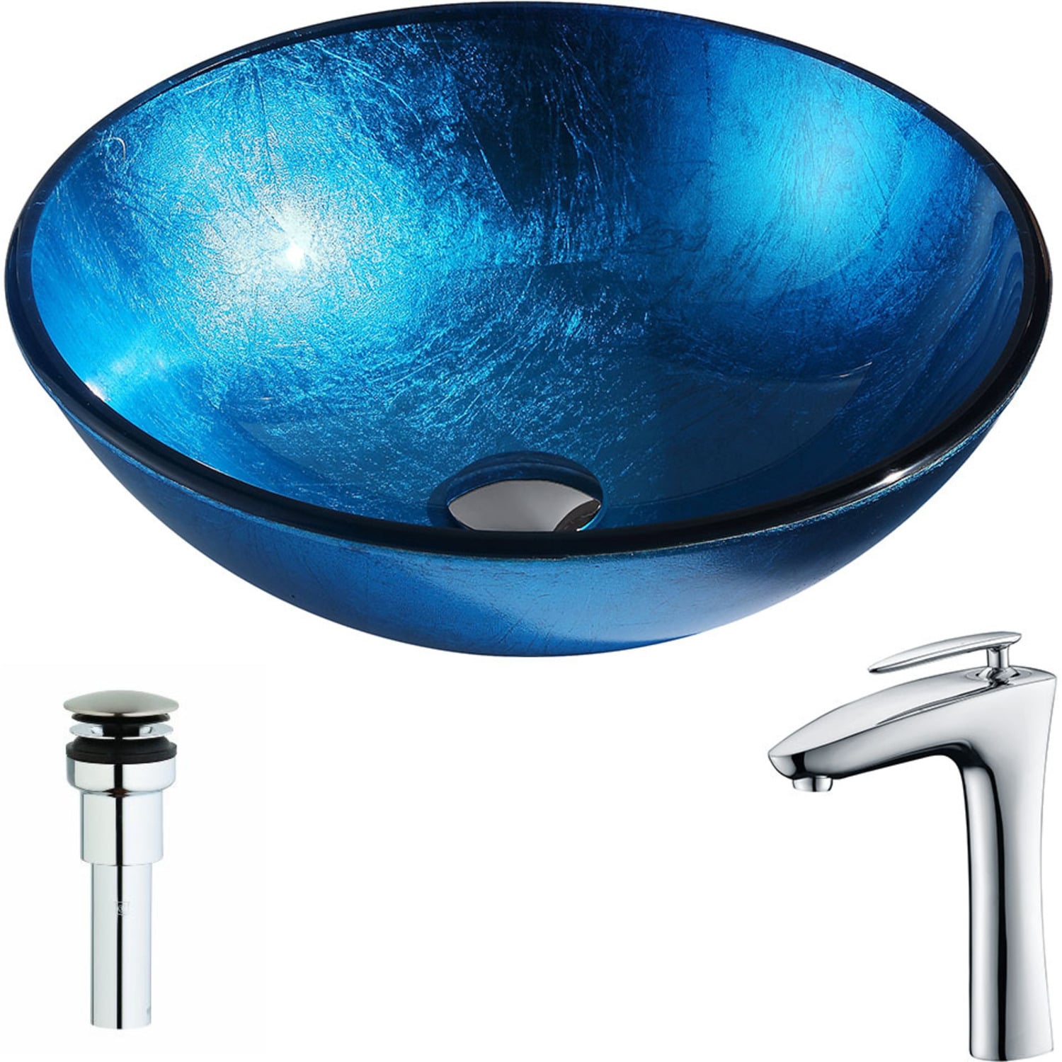 Anzzi Arc Series Deco-Glass Vessel Sink in Lustrous Light Blue with Crown Faucet in Chrome, 848308085479, LSAZ078-022