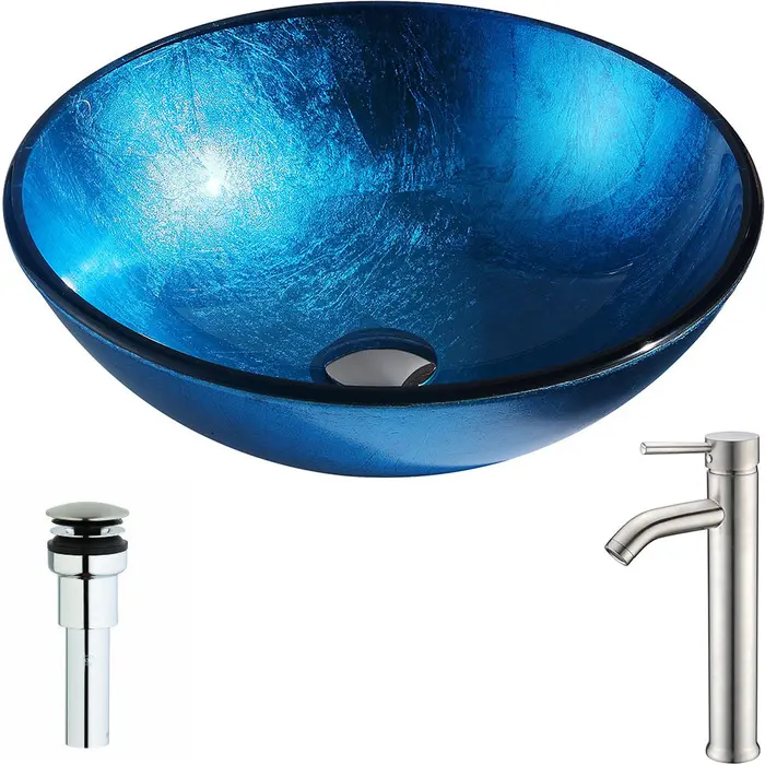 The ANZZI Arc Series sink is a traditionally crafted round vessel sink adorned in a Lustrous Light Blue Finish. Coupled with the ANZZI Fann Vessel Sink Faucet, this combination provides pure elegance in any bathroom. Each ANZZI vessel sink and faucet is formed using RHINO ALLOY certified materials for strength and quality along with high tempered Deco-Glass. The result is a perfectly shaped dynamically captivating vessel and faucet centerpiece for any bathroom counter.Lustrous light blue finishANZZI Fann vessel sink faucet L-AZ041RHINO ALLOY certified tempered deco-glass constructionScratch-tough and stain-resistant non-porous surfaceEasy-to-clean low maintenanceTop Mount installationDimensions: 16.5 in. L x 16.5 in. W x 5.5 in. HDeco-Glass thickness 1/2 in.Single 3/4 in. standard drain openingTo speak to a knowledgeable and dedicated ANZZI specialist simply call 1-844-44-ANZZI or visit us on the web at www.ANZZI.com