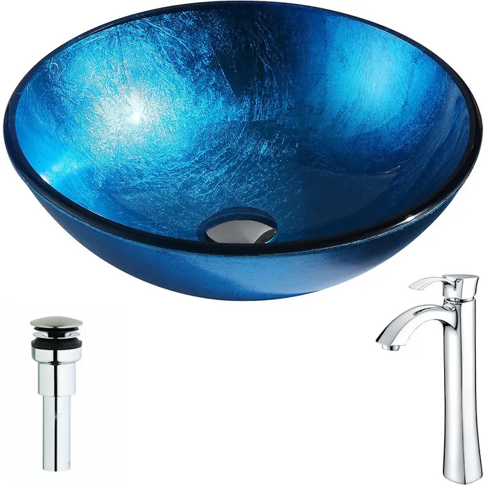 The ANZZI Arc Series sink is a traditionally crafted round vessel sink adorned in a Lustrous Light Blue Finish. Coupled with the ANZZI Harmony Vessel Sink Faucet, this combination provides pure elegance in any bathroom. Each ANZZI vessel sink and faucet is formed using RHINO ALLOY certified materials for strength and quality along with high tempered Deco-Glass. The result is a perfectly shaped dynamically captivating vessel and faucet centerpiece for any bathroom counter.Lustrous light blue finishANZZI Harmony series vessel sink faucet L-AZ095RHINO ALLOY certified tempered deco-glass constructionScratch-tough and stain-resistant non-porous surfaceEasy-to-clean low maintenanceTop Mount installationDimensions: 16.5 in. L x 16.5 in. W x 5.5 in. HDeco-Glass thickness 1/2 in.Single 3/4 in. standard drain openingTo speak to a knowledgeable and dedicated ANZZI specialist simply call 1-844-44-ANZZI or visit us on the web at www.ANZZI.com