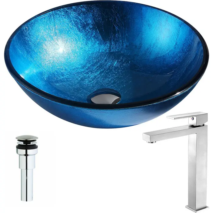 The ANZZI Arc Series sink is a traditionally crafted round vessel sink adorned in a Lustrous Light Blue Finish. Coupled with the ANZZI Enti Vessel Sink Faucet, this combination provides pure elegance in any bathroom. Each ANZZI vessel sink and faucet is formed using RHINO ALLOY certified materials for strength and quality along with high tempered Deco-Glass. The result is a perfectly shaped dynamically captivating vessel and faucet centerpiece for any bathroom counter.Lustrous light blue finishANZZI Enti vessel sink faucet L-AZ096BNRHINO ALLOY certified tempered deco-glass constructionScratch-tough and stain-resistant non-porous surfaceEasy-to-clean low maintenanceTop Mount installationDimensions: 16.5 in. L x 16.5 in. W x 5.5 in. HDeco-Glass thickness 1/2 in.Single 3/4 in. standard drain openingTo speak to a knowledgeable and dedicated ANZZI specialist simply call 1-844-44-ANZZI or visit us on the web at www.ANZZI.com