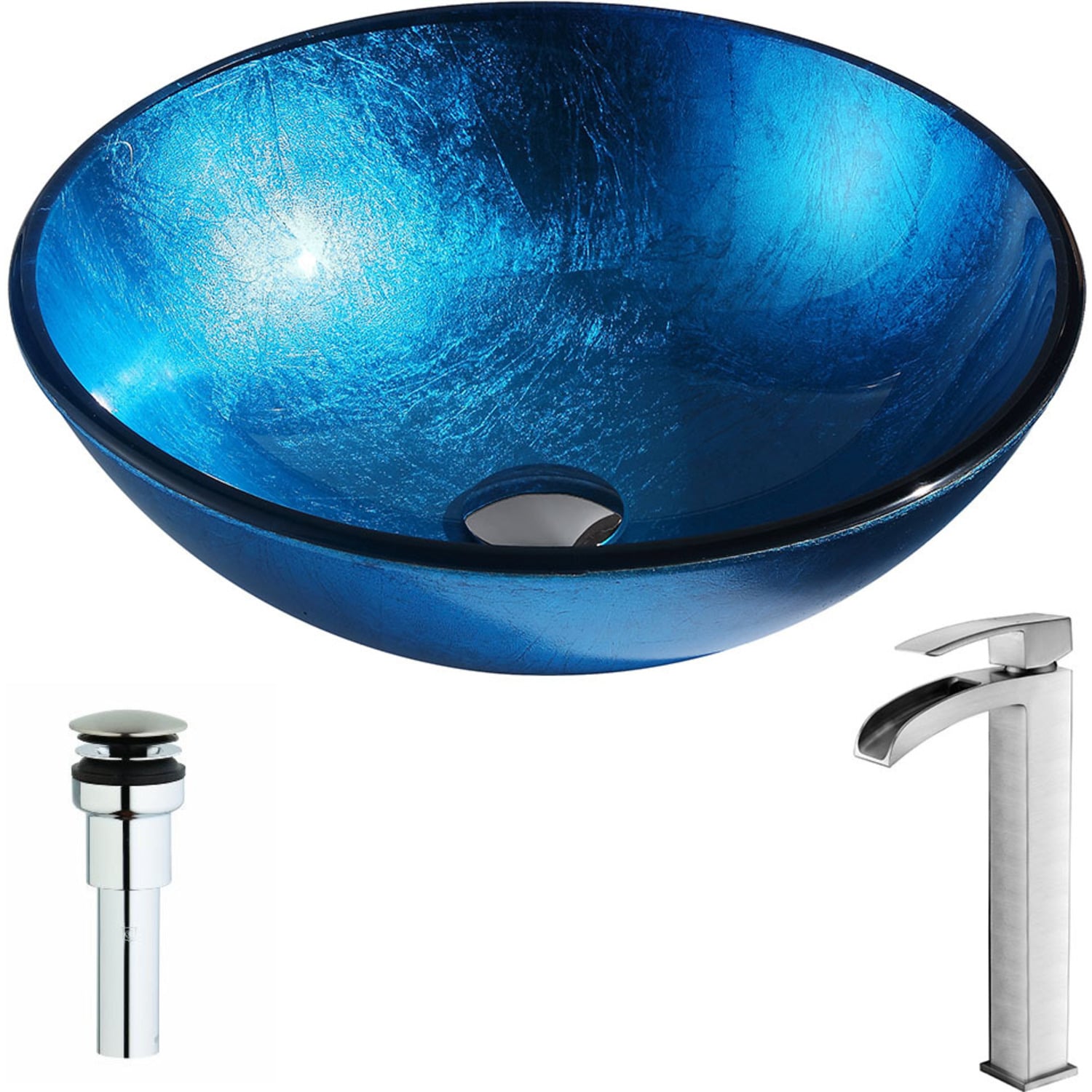 The ANZZI Arc Series sink is a traditionally crafted round vessel sink adorned in a Lustrous Light Blue Finish. Coupled with the ANZZI Key Vessel Sink Faucet, this combination provides pure elegance in any bathroom. Each ANZZI vessel sink and faucet is formed using RHINO ALLOY certified materials for strength and quality along with high tempered Deco-Glass. The result is a perfectly shaped dynamically captivating vessel and faucet centerpiece for any bathroom counter.Lustrous light blue finishANZZI Key vessel sink faucet L-AZ097BNRHINO ALLOY certified tempered deco-glass constructionScratch-tough and stain-resistant non-porous surfaceEasy-to-clean low maintenanceTop Mount installationDimensions: 16.5 in. L x 16.5 in. W x 5.5 in. HDeco-Glass thickness 1/2 in.Single 3/4 in. standard drain openingTo speak to a knowledgeable and dedicated ANZZI specialist simply call 1-844-44-ANZZI or visit us on the web at www.ANZZI.com