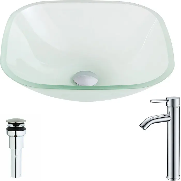 The ANZZI Vista Series sink is a traditionally crafted squared vessel sink adorned in a Lustrous Frosted Finish. Coupled with the ANZZI Fann Vessel Sink Faucet, this combination provides pure elegance in any bathroom. Each ANZZI vessel sink and faucet is formed using RHINO ALLOY certified materials for strength and quality along with high tempered Deco-Glass. The result is a perfectly shaped dynamically captivating vessel and faucet centerpiece for any bathroom counter.Lustrous frosted finishANZZI Fann vessel sink faucet L-AZ040RHINO ALLOY certified tempered deco-glass constructionScratch-tough and stain-resistant non-porous surfaceEasy-to-clean low maintenanceTop Mount installationDimensions: 16.5 in. L x 16.5 in. W x 5.125 in. HDeco-Glass thickness 1/2 in.Single 3/4 in. standard drain openingTo speak to a knowledgeable and dedicated ANZZI specialist simply call 1-844-44-ANZZI or visit us on the web at www.ANZZI.com