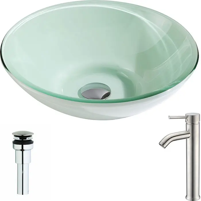 Anzzi Sonata Series Deco-Glass Vessel Sink in Lustrous Light Green with Fann Faucet in Brushed Nickel, 848308084755, LSAZ083-040