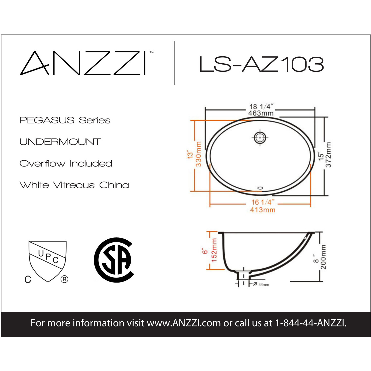 Introduce an exquisite piece of modern contemporary artistry to your wash room with the ANZZI Pegasus Series undermount Vitreous China bathroom sink. The ANZZI Pegasus is crafted using the finest quality Vitreous China resulting in a smoothly polished basin with the delicate features of fine china and the stubborn durability of high end ceramics. ANZZI continues to deliver the latest trends and modern styles to your home to help you build your ideal living space.RHINO ALLOY approved artisan strength Vitreous China materialNon-porous long lasting polished White finishFront side built in overflowcUPC & CSA certifiedDimensions: 18.25 in. x 15 in.Standard 1.75 in. drain openingDrain assembly not includedNo faucet holesShips from warehouse within 24 hours of order processingLimited Lifetime WarrantyTo speak to a knowledgeable and dedicated ANZZI specialist simply call 1-844-44-ANZZI or visit us on the web at www.ANZZI.com