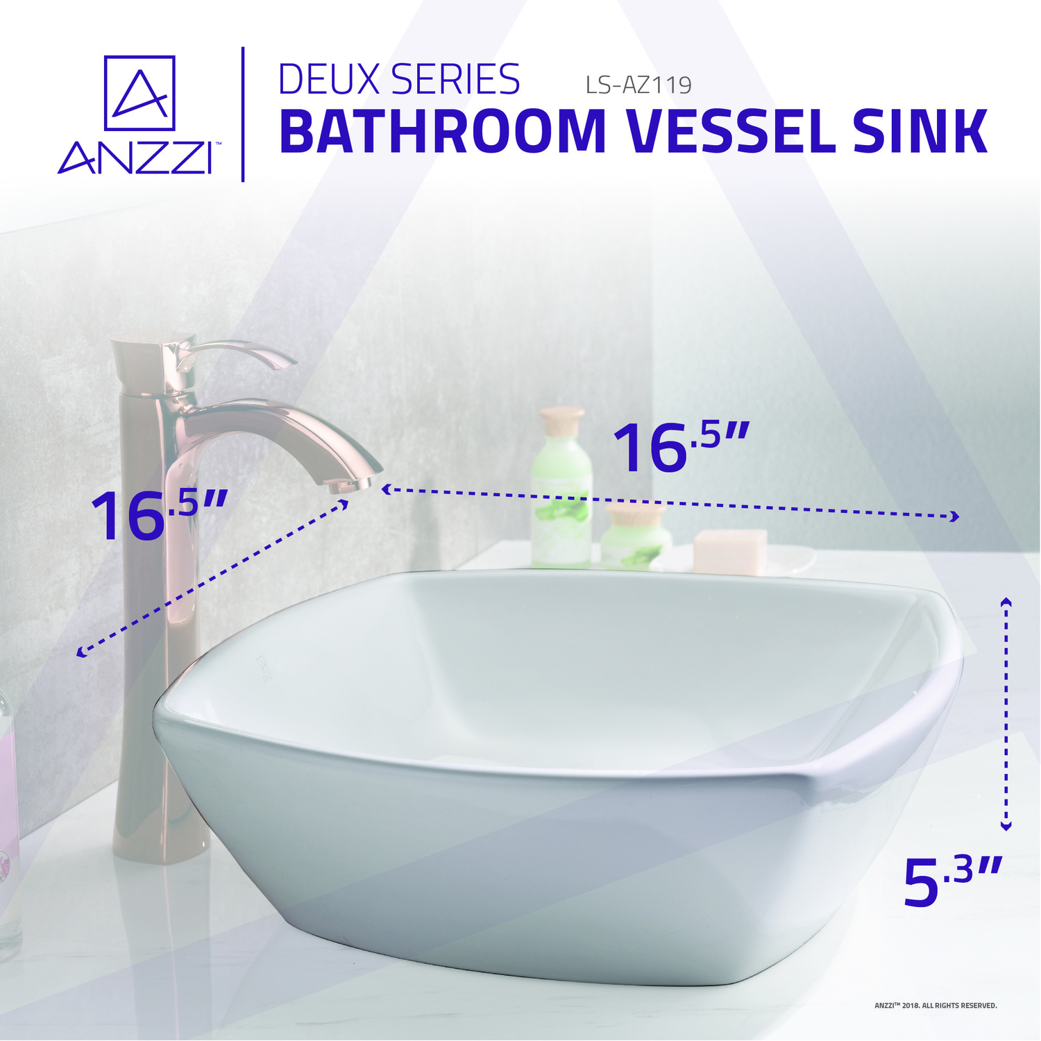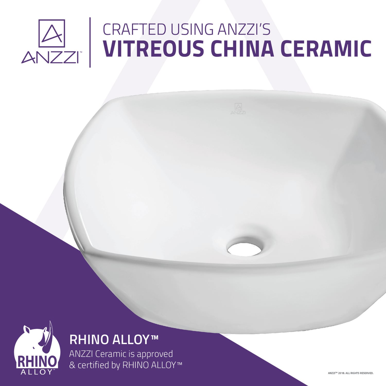 Introduce an exquisite piece of modern contemporary artistry to your wash room with the ANZZI Deux Series Vessel Vitreous China bathroom sink. The ANZZI Deux is crafted using the finest quality Vitreous China resulting in a smoothly polished basin with the delicate features of fine china and the stubborn durability of high end ceramics. ANZZI continues to deliver the latest trends and modern styles to your home to help you build your ideal living space.RHINO ALLOY approved artisan strength Vitreous China materialNon-porous long lasting polished White finishNo overflowcUPC & CSA certifiedDimensions: 16.5 in. x 16.5 in.Standard 1.75 in. drain openingDrain assembly not includedNo faucet holesEasy DIY friendly top mounted installationShips from warehouse within 24 hours of order processingLimited Lifetime WarrantyTo speak to a knowledgeable and dedicated ANZZI specialist simply call 1-844-44-ANZZI or visit us on the web at www.ANZZI.com