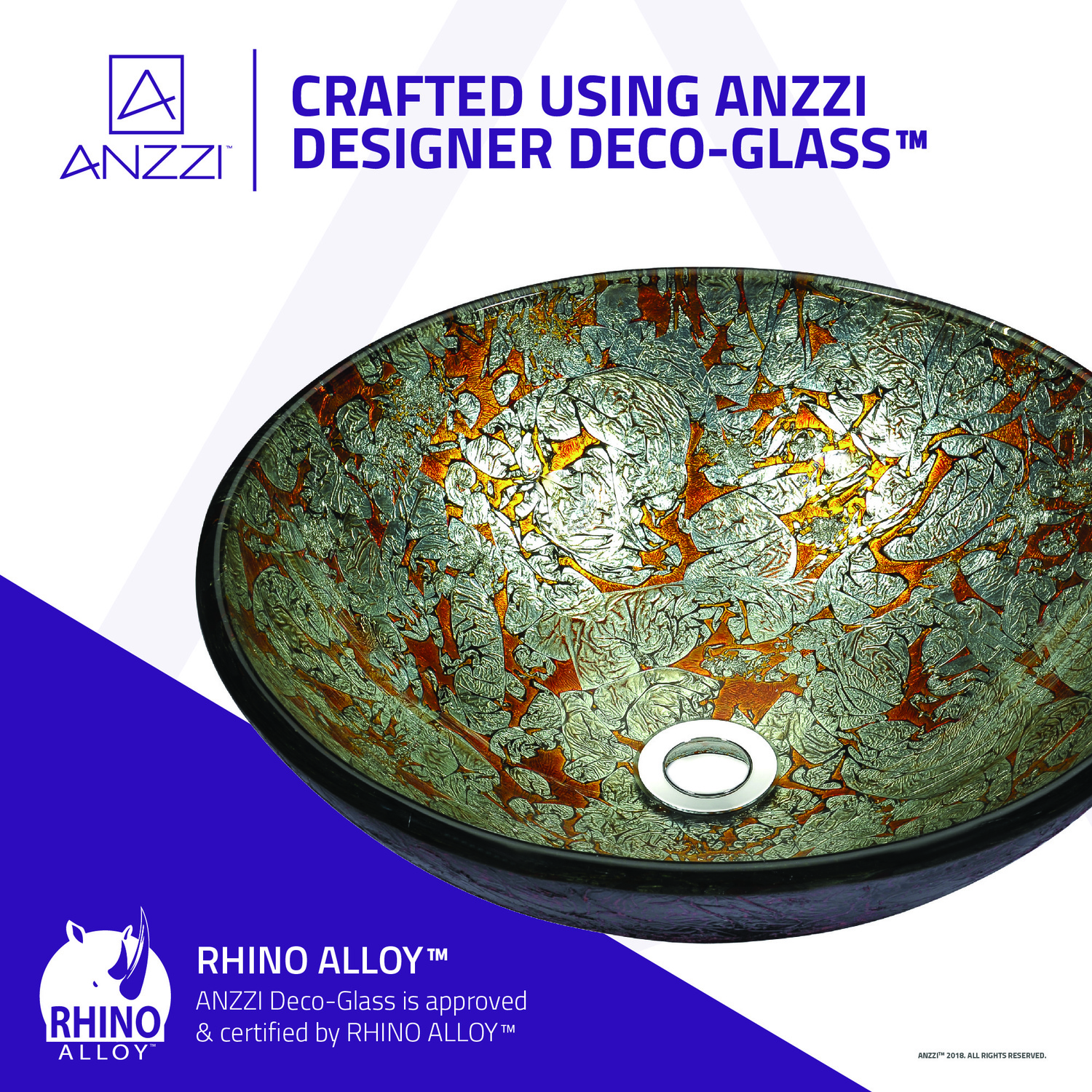 The ANZZI Stellar Series sink is a traditionally crafted round vessel sink adorned in an Arctic Blaze finish. Each ANZZI vessel sink is formed using RHINO ALLOY certified high tempered Deco-Glass material. The result is an elegantly shaped and captivating vessel centerpiece for any bathroom counter.RHINO ALLOY certified tempered deco-glass constructionScratch-tough and stain-resistant non-porous surfaceEasy-to-clean low maintenanceTop mount installationDimensions: 16.5 in. L x 16.5 in. W x 5.7 in. HDeco-glass thickness: 1/2 in.Single 1.75 in. standard drain openingANZZI Polished Chrome pop-up drain includedShips from factory within 24 hours once order is processedLimited Lifetime WarrantyTo speak to a knowledgeable and dedicated ANZZI specialist simply call 1-844-44-ANZZI or visit us on the web at www.ANZZI.com
