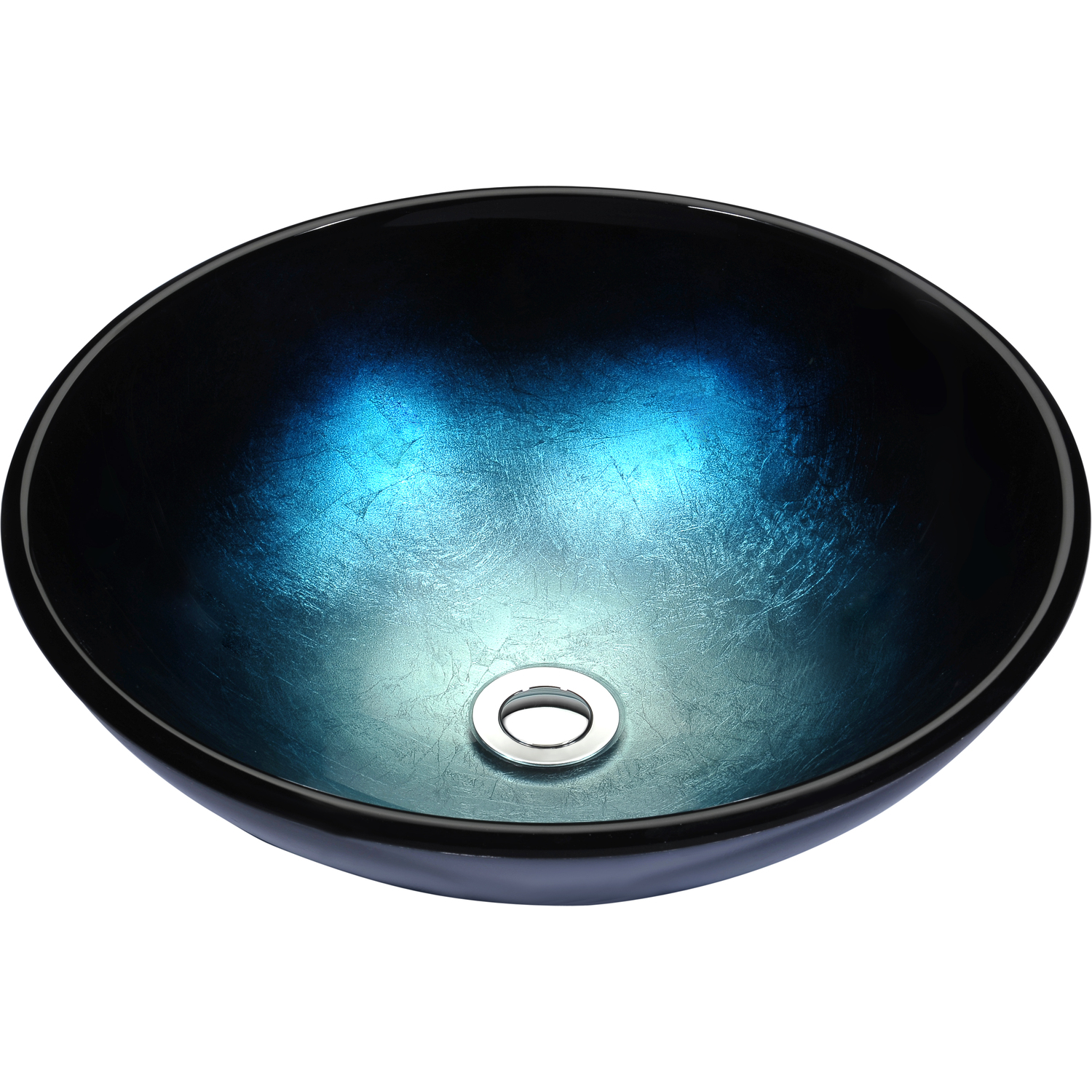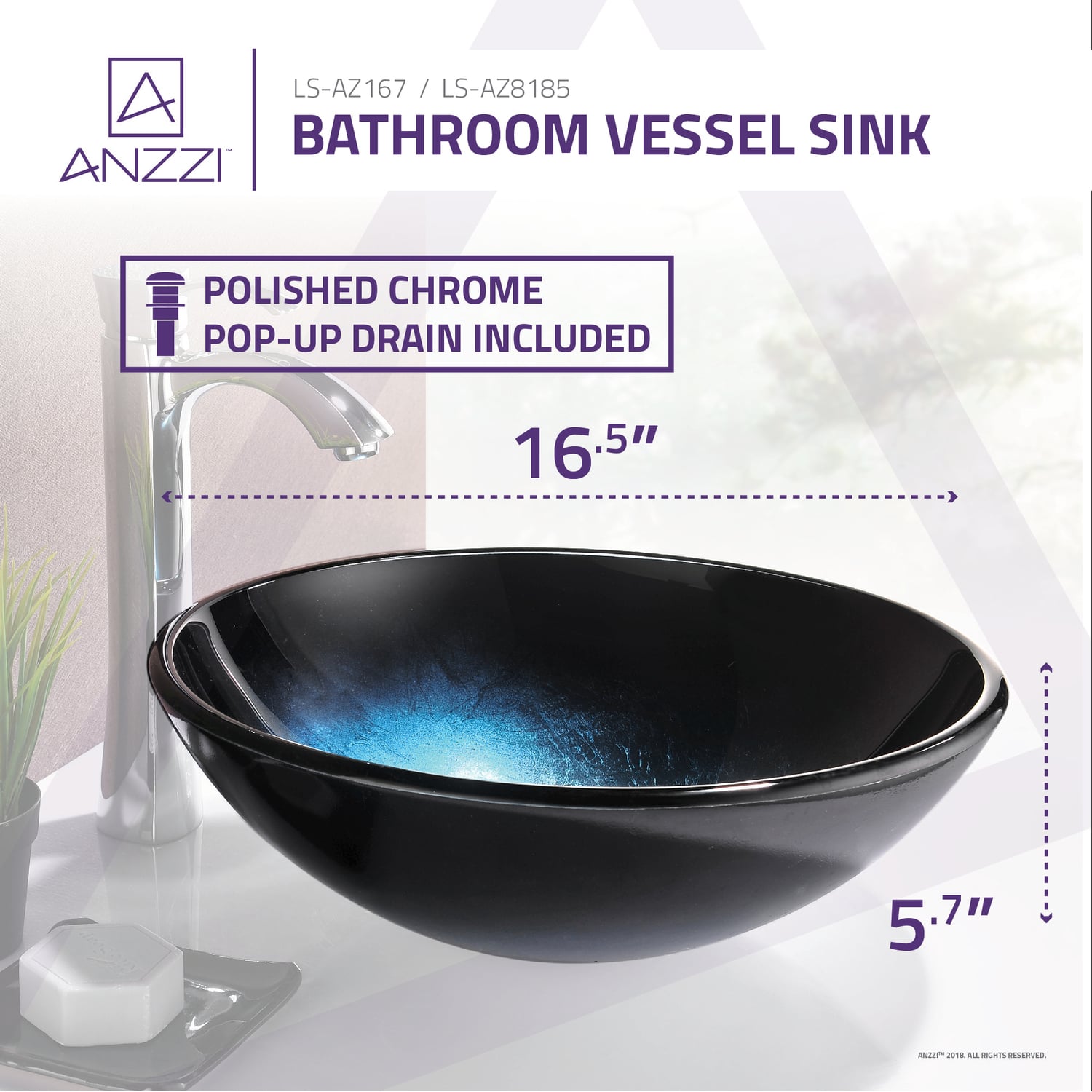 The ANZZI Stellar Series sink is a traditionally crafted round vessel sink adorned in a Deep Sea finish. Each ANZZI vessel sink is formed using RHINO ALLOY certified high tempered Deco-Glass material. The result is an elegantly shaped and captivating vessel centerpiece for any bathroom counter.RHINO ALLOY certified tempered deco-glass constructionScratch-tough and stain-resistant non-porous surfaceEasy-to-clean low maintenanceTop mount installationDimensions: 16.5 in. L x 16.5 in. W x 5.7 in. HDeco-glass thickness: 1/2 in.Single 1.75 in. standard drain openingANZZI Polished Chrome pop-up drain includedShips from factory within 24 hours once order is processedLimited Lifetime WarrantyTo speak to a knowledgeable and dedicated ANZZI specialist simply call 1-844-44-ANZZI or visit us on the web at www.ANZZI.com