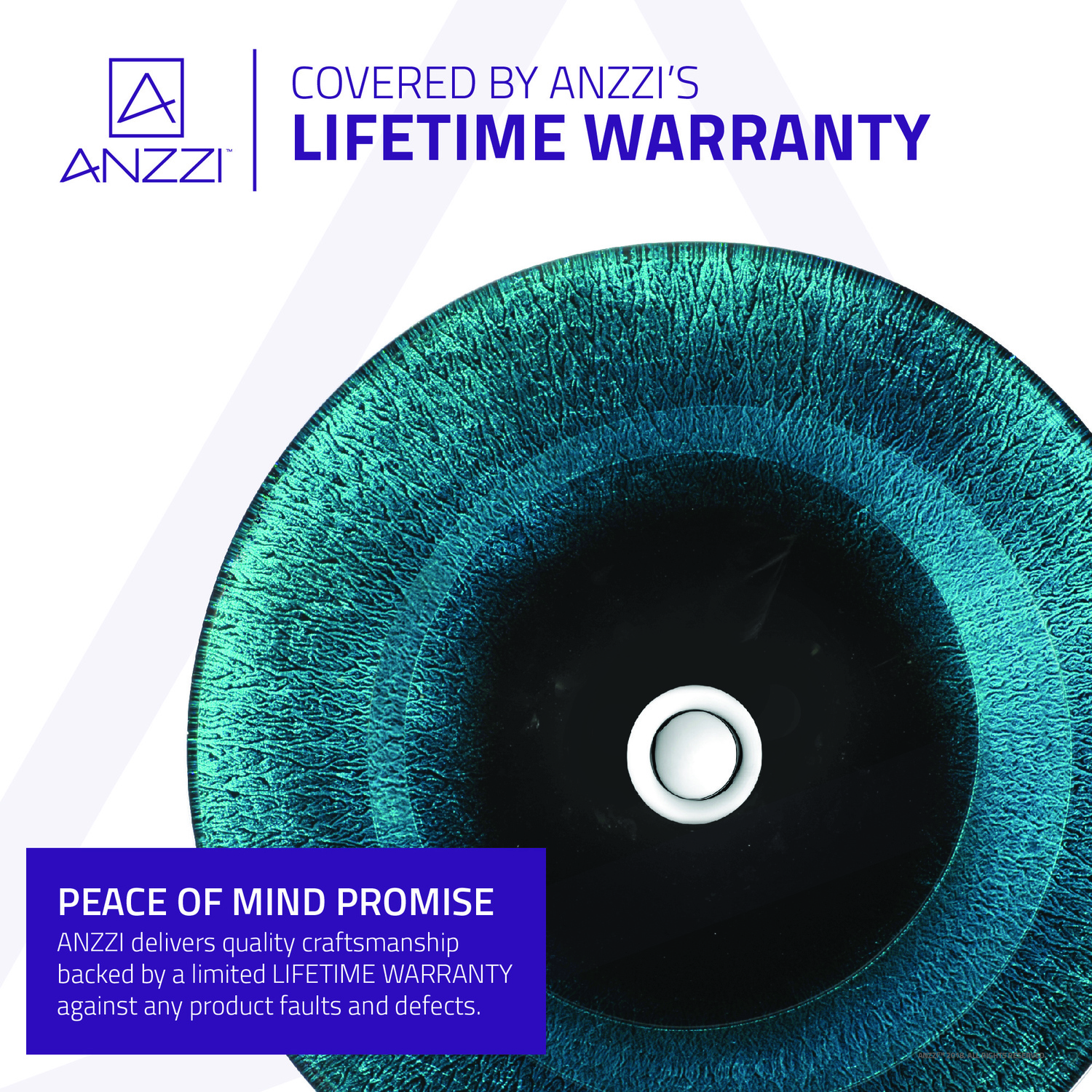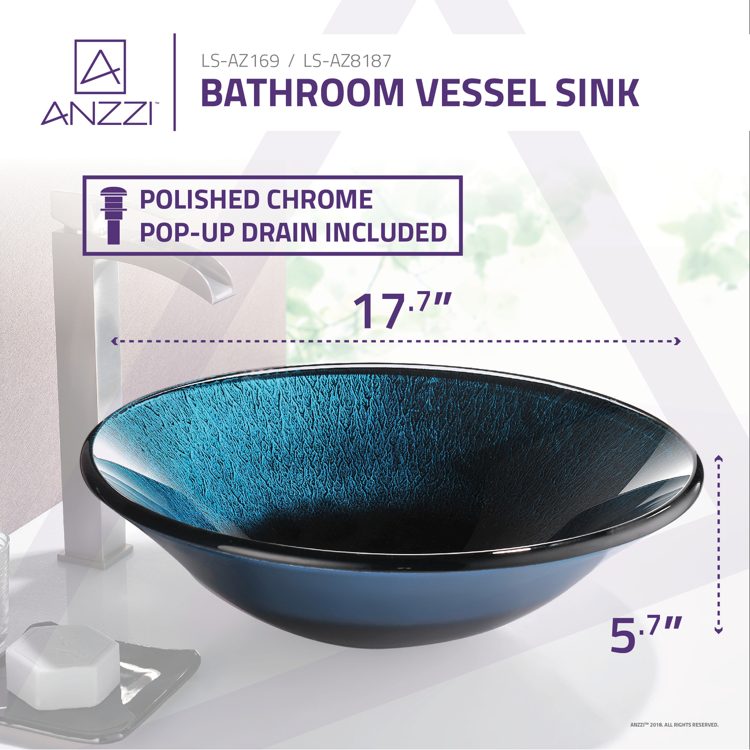 The ANZZI Stellar Series sink is a traditionally crafted round vessel sink adorned in a Marine Crest finish. Each ANZZI vessel sink is formed using RHINO ALLOY certified high tempered Deco-Glass material. The result is an elegantly shaped and captivating vessel centerpiece for any bathroom counter.RHINO ALLOY certified tempered deco-glass constructionScratch-tough and stain-resistant non-porous surfaceEasy-to-clean low maintenanceTop mount installationDimensions: 17.7 in. L x 17.7 in. W x 5.7 in. HDeco-glass thickness: 1/2 in.Single 1.75 in. standard drain openingANZZI Polished Chrome pop-up drain includedShips from factory within 24 hours once order is processedLimited Lifetime WarrantyTo speak to a knowledgeable and dedicated ANZZI specialist simply call 1-844-44-ANZZI or visit us on the web at www.ANZZI.com