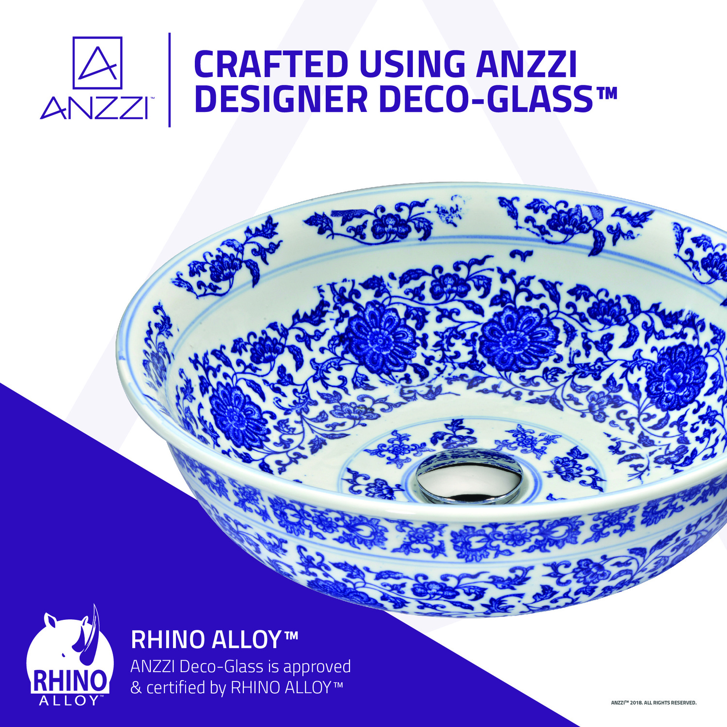 The ANZZI Cadence Series sink is a traditionally crafted round vessel sink adorned in a Décor White finish. Each ANZZI vessel sink is formed using RHINO ALLOY certified high tempered Deco-Glass material. The result is an elegantly shaped and captivating vessel centerpiece for any bathroom counter.RHINO ALLOY certified tempered deco-glass construction in a stunning Décor White finishScratch-tough and stain-resistant non-porous surfaceEasy-to-clean low maintenanceTop mount installationDimensions: 16.1 in. L x 16.1 in. W x 6.5 in. HDeco-glass thickness: 1/2 in.Single 1.75 in. standard drain openingANZZI Polished Chrome pop-up drain includedShips from factory within 24 hours once order is processedLimited Lifetime WarrantyTo speak to a knowledgeable and dedicated ANZZI specialist simply call 1-844-44-ANZZI or visit us on the web at www.ANZZI.com