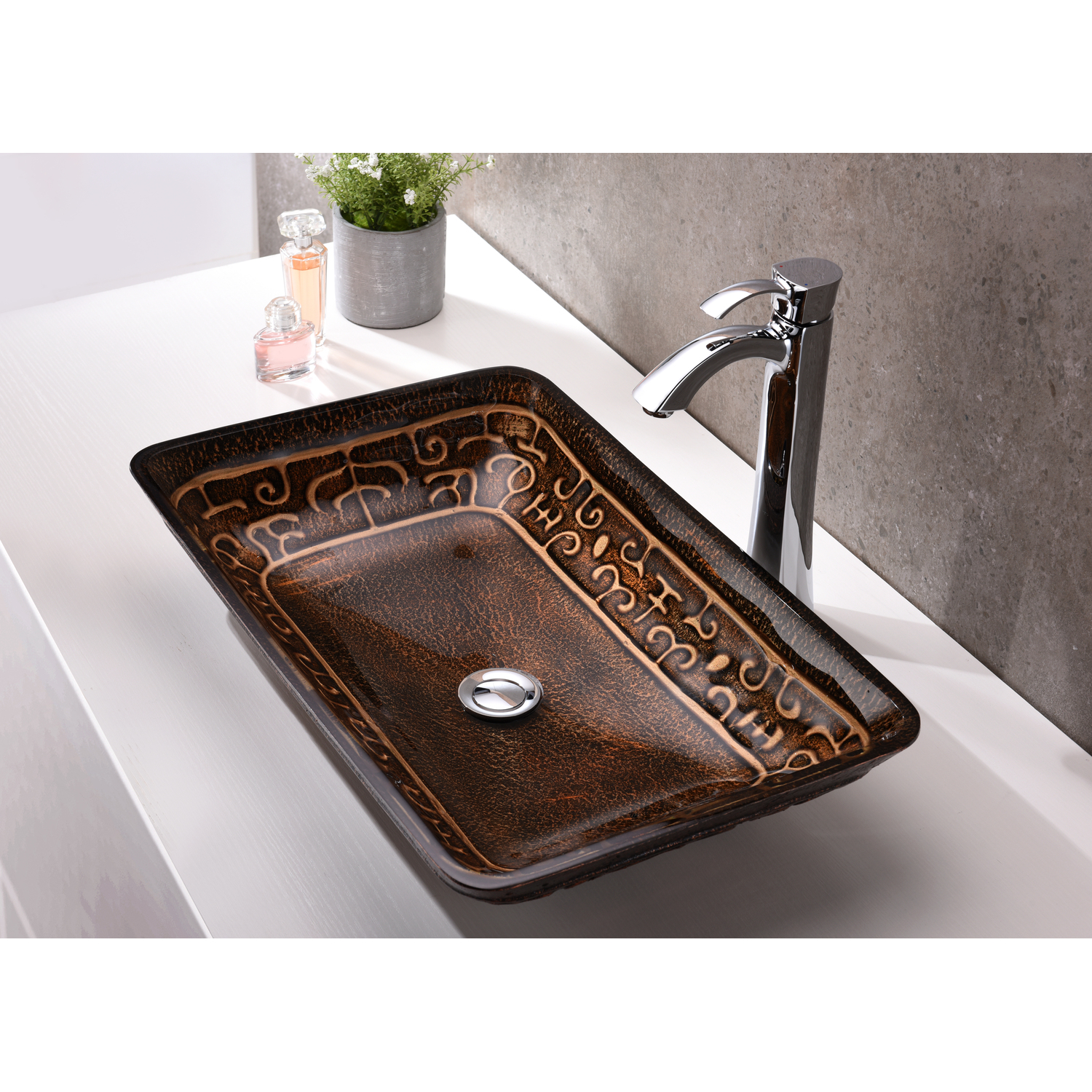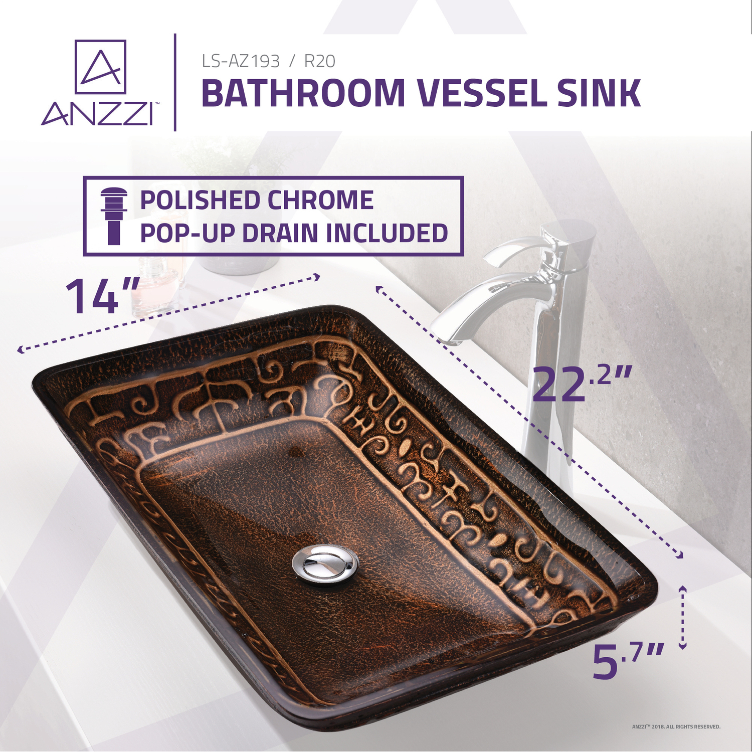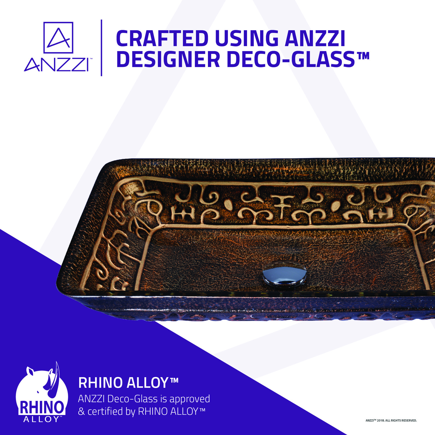 The ANZZI Alto Series sink is a traditionally crafted round vessel sink adorned in a Macedonian Bronze finish. Each ANZZI vessel sink is formed using RHINO ALLOY certified high tempered Deco-Glass material. The result is an elegantly shaped and captivating vessel centerpiece for any bathroom counter.RHINO ALLOY certified tempered deco-glass construction in a stunning Macedonian Bronze finishScratch-tough and stain-resistant non-porous surfaceEasy-to-clean low maintenanceTop mount installationDimensions: 22.2 in. L x 14 in. W x 5.7 in. HDeco-glass thickness: 1/2 in.Single 1.75 in. standard drain openingANZZI Polished Chrome pop-up drain includedShips from factory within 24 hours once order is processedLimited Lifetime WarrantyTo speak to a knowledgeable and dedicated ANZZI specialist simply call 1-844-44-ANZZI or visit us on the web at www.ANZZI.com
