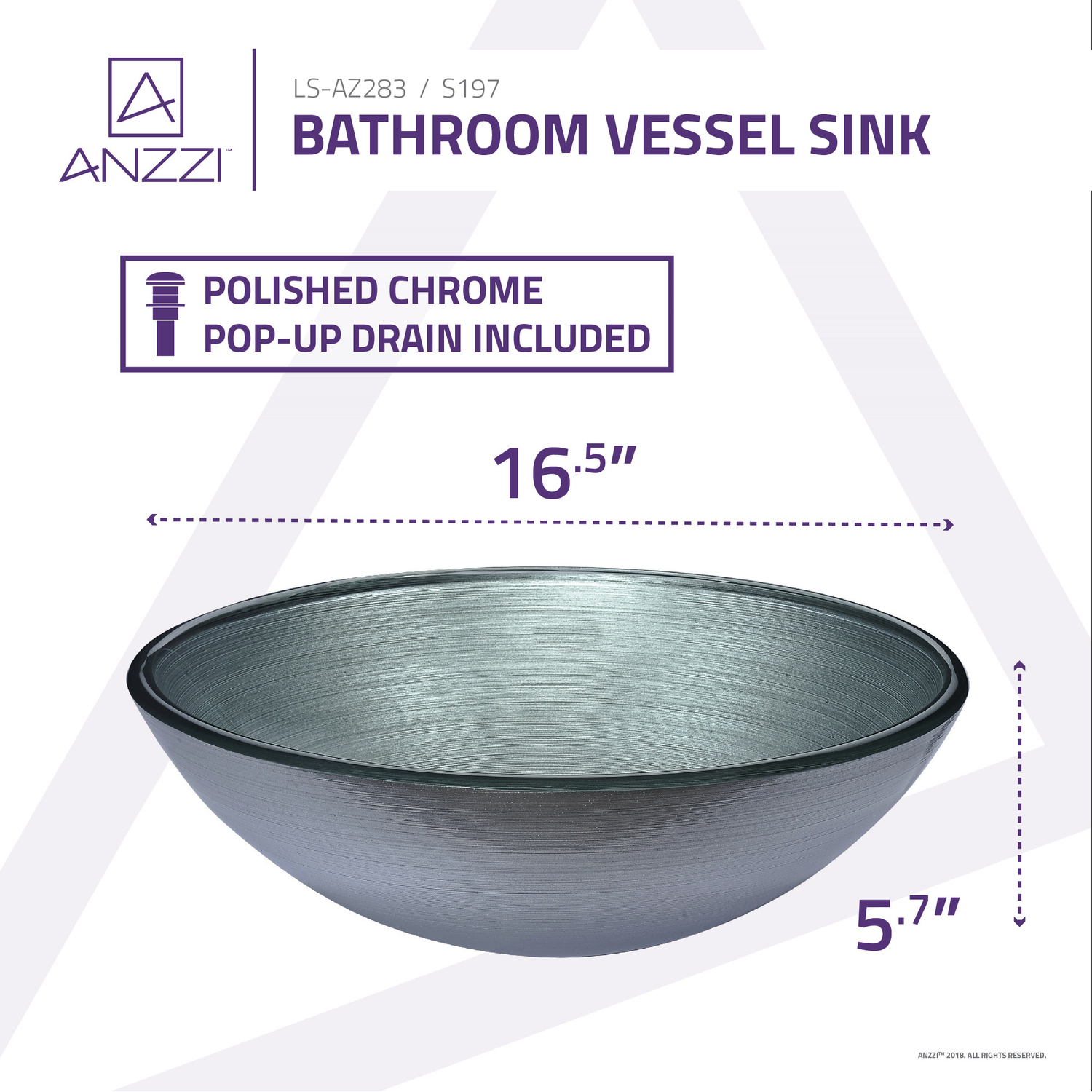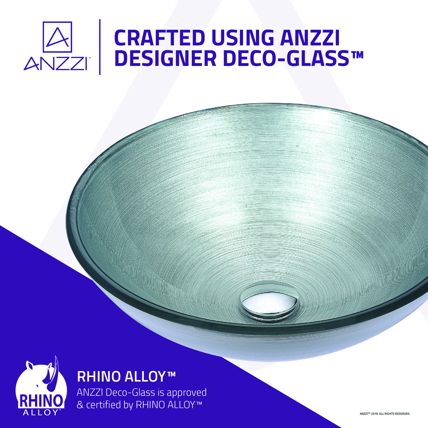 The ANZZI Posh Series sink is a traditionally crafted round vessel sink adorned in a Brushed Silver finish. Each ANZZI vessel sink is formed using RHINO ALLOY certified high tempered Deco-Glass material. The result is an elegantly shaped and captivating vessel centerpiece for any bathroom counter.RHINO ALLOY certified tempered deco-glass construction in a stunning Brushed Silver finishScratch-tough and stain-resistant non-porous surfaceEasy-to-clean low maintenanceTop mount installationDimensions: 16.5 in. L x 16.5 in. W x 5.7 in. HDeco-glass thickness: 1/2 in.Single 1.75 in. standard drain openingANZZI polished chrome pop-up drain includedShips from factory within 24 hours once order is processedLifetime WarrantyTo speak to a knowledgeable and dedicated ANZZI specialist simply call 1-844-44-ANZZI or visit us on the web at www.ANZZI.com